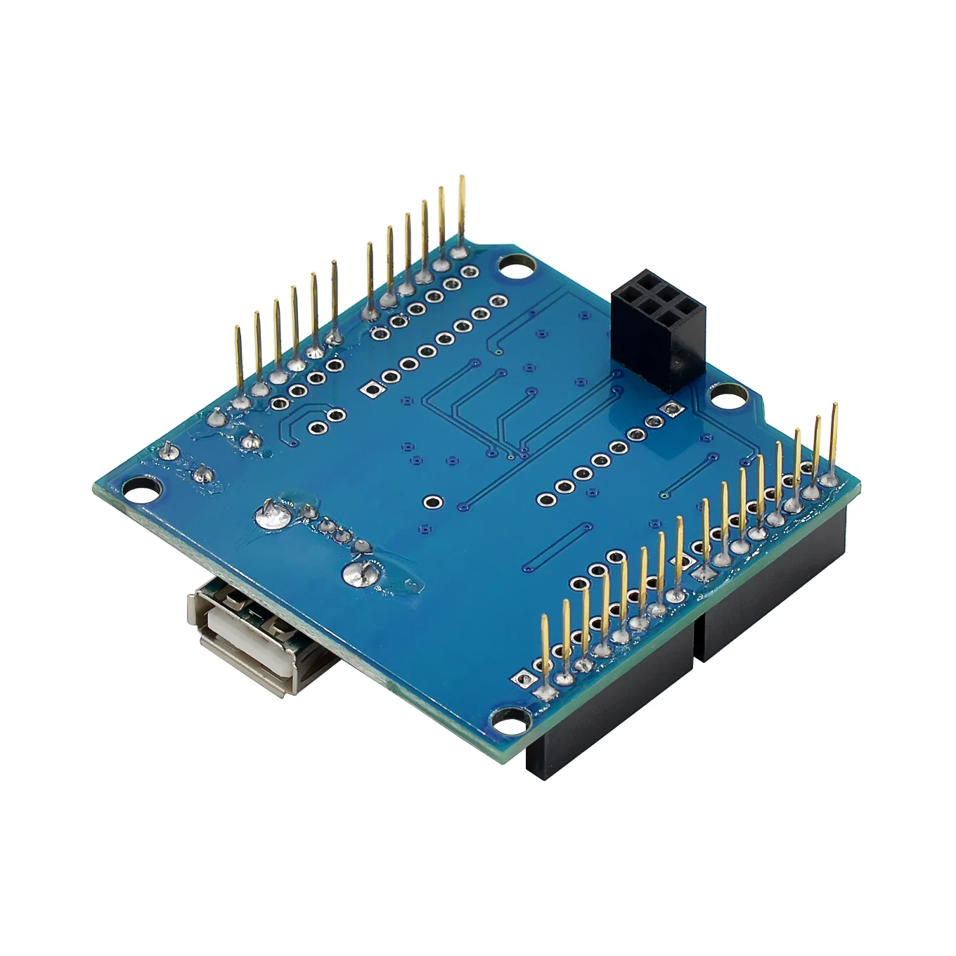 This vibrant blue USB Host Shield is designed for use with Arduino boards, including Uno 328, Diecimila / Duemilanove 328, Mega 1280, and Mega 2560 (recommended), enabling USB host and HUB functions for seamless communication with external USB devices. Supporting Google Android ADK and compatible with Android phones such as G1, Nexus One, Nexus S, and Motorola Droid X—requiring device upgrades to Android 2.3.4 or 3.1 for tablets—it provides APK packages and compiled source files for development. The shield features a sleek, organized layout with a silver USB Type-A port, black pin headers, white silkscreen labels, and mounting holes, making it a reliable choice for advanced electronic projects.