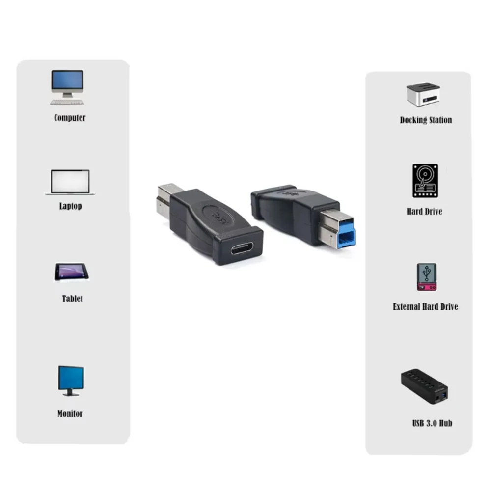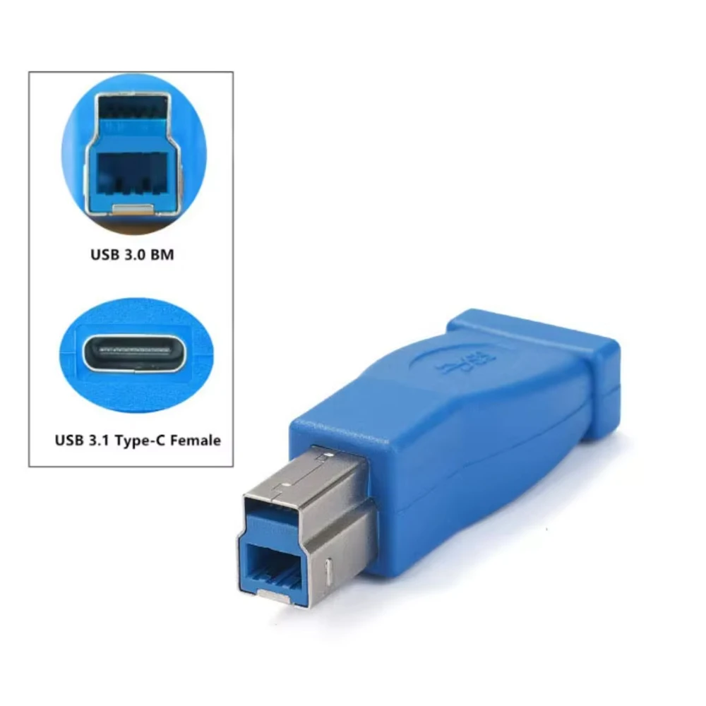 Experience seamless data transfer and charging with this compact USB Type C 3.1 Female to USB 3.0 B Male Adapter, supporting speeds up to 5Gbps and a 5V 2A charging capacity. Designed for versatile compatibility, it connects USB-C devices to external hard drives, printers, scanners, digital cameras, docking stations, and monitors with USB 3.0 B or Type B ports. The sleek, ergonomic blue or black plastic body features a textured surface and smooth rounded edges, ensuring portability and ease of handling. Built with durable metallic connectors, this adapter provides reliable performance for efficient data transmission and power delivery on the go.