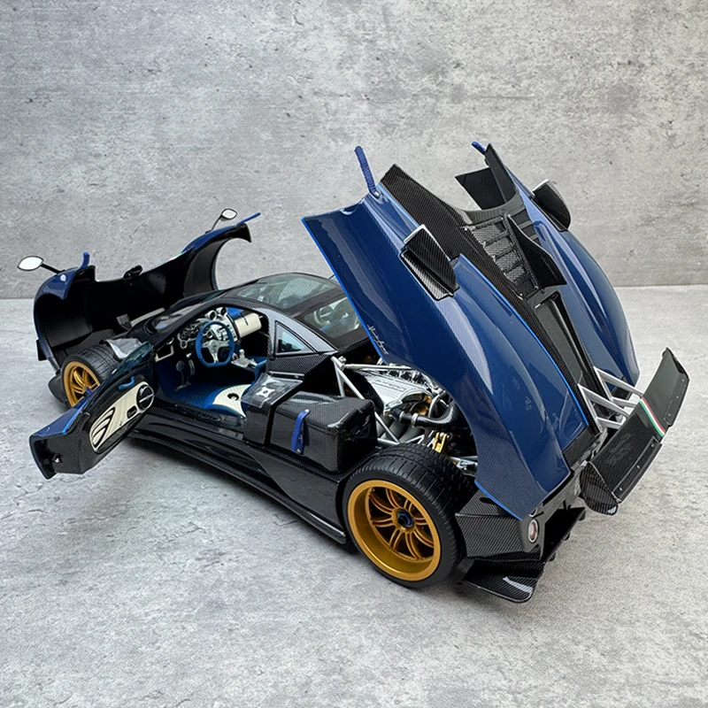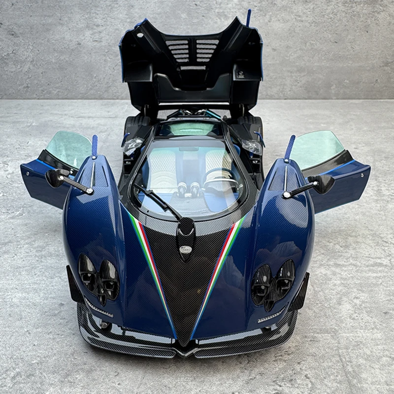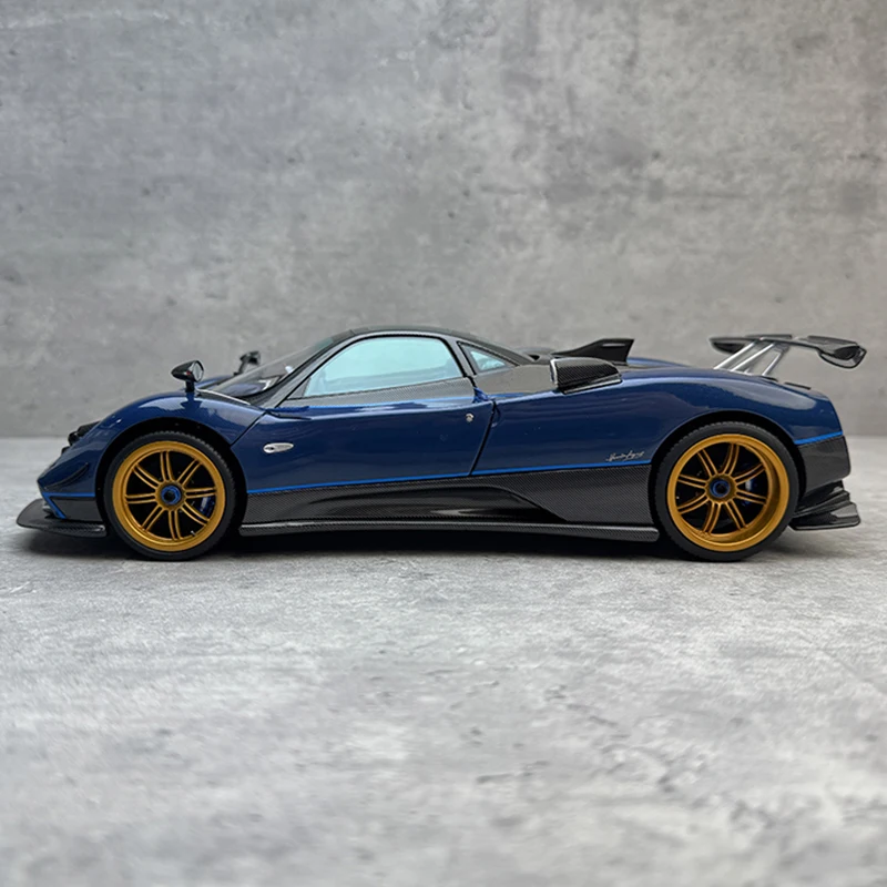 Imagine adding a touch of racing heritage to your collection with this highly detailed diecast Zonda F sports car model. Crafted at a 1:18 scale, it measures approximately 25 cm long, 13 cm wide, and 6.5 cm tall, weighing about 0.9 kg. The vibrant metallic blue finish combined with glossy surfaces captures the sleek aerodynamic design perfectly. Realistic features such as a pointed low-slung front end, a central carbon fiber-patterned hood, and broad wheel arches with gold multi-spoke rims make this model a standout piece. The transparent windows reveal a light-colored interior, and the prominent rear wing adds a racing-inspired touch. This model offers functional doors, hood, and trunk, making it an engaging display item for any enthusiast’s collection.