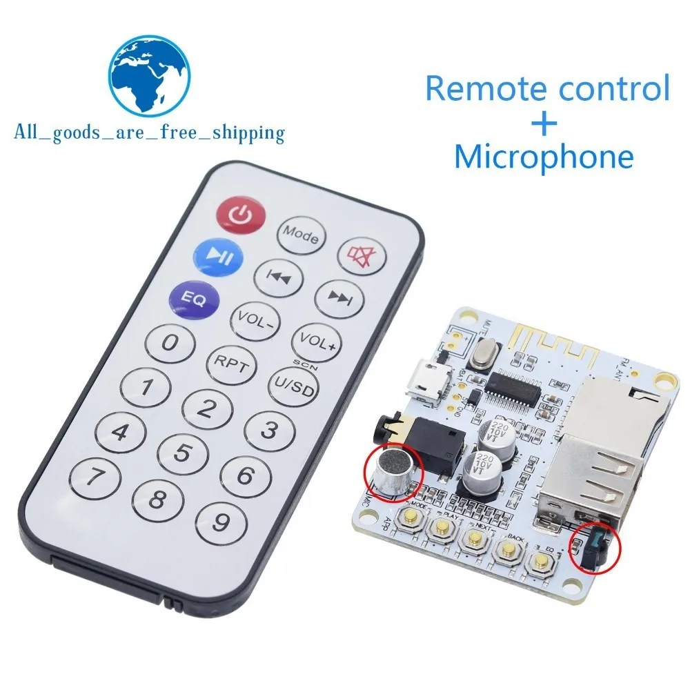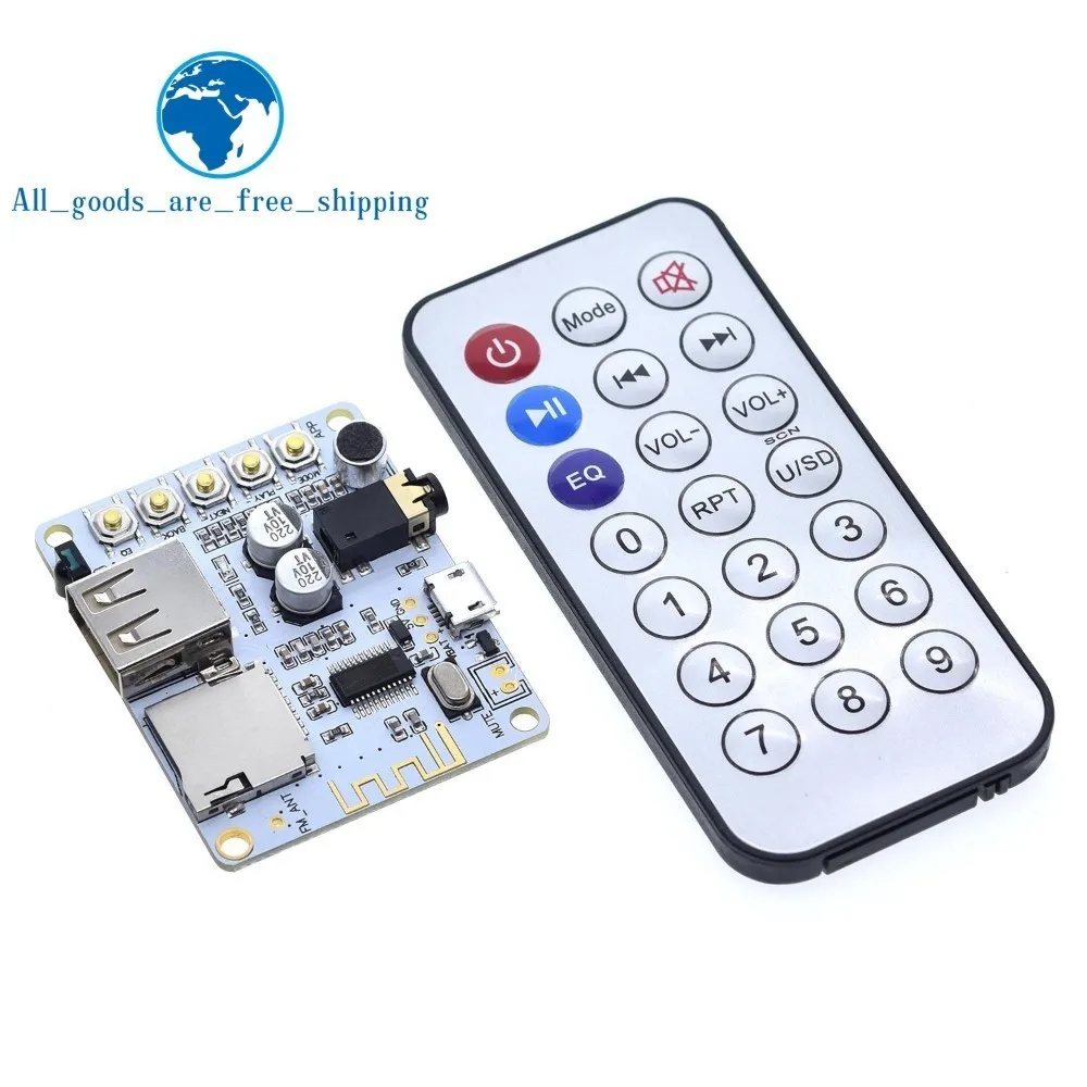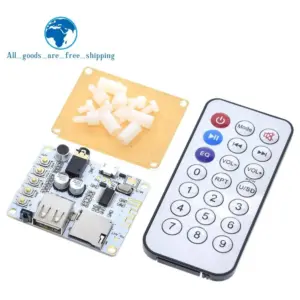 Experience seamless wireless music playback with this sleek, modern Bluetooth-5.0 MP3 audio module from TZT. Designed in a compact rectangular shape, it features a pristine white circuit board that showcases organized electronics, chips, resistors, and connectors. The clean aesthetic emphasizes functionality and ease of integration into custom audio projects. The module includes a USB port and TF card slot, allowing versatile decoding and playback options. Its minimalistic design is complemented by a black remote control with a smooth, ergonomic curved shape, and color accents—such as a red power button and blue play icon—that create subtle visual interest. Ideal for hobbyists and professionals alike, this module combines modern style with reliable technical performance, elevating your audio DIY projects.