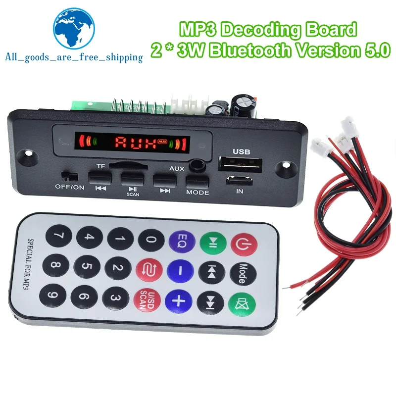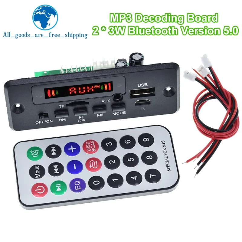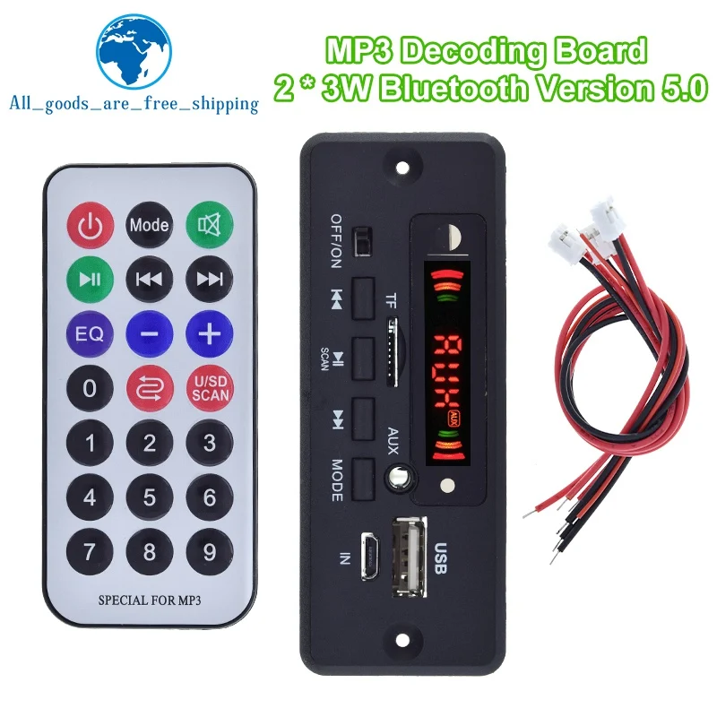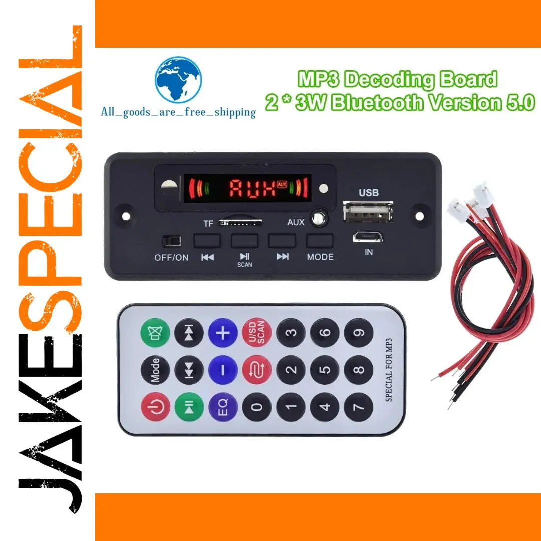 Elevate your audio experience with this modern, matte black Bluetooth 5.0 MP3 decoder board. Its minimalist rectangular design features a bright digital display that clearly shows modes like “AUX,” surrounded by vibrant red LED indicators hinting at active signal transmission. The device boasts an intuitive control panel with simple black buttons labeled for power, mode, scan, and playback, providing seamless operation. The side ports, including a USB, micro-USB, TF card slot, and AUX input, are neatly integrated into its compact form. Paired with the colorful remote control, which offers quick access to functions like volume, EQ, mode, and playback controls, this module promises an enjoyable, hassle-free user experience. Its sturdy wiring bundle with red and black wires and white connectors ensures reliable power and signal connections. This versatile decoder is perfect for customizing your audio system, whether in a car or on your computer, offering flexibility with support for FM radio, TF cards, USB sticks, AUX input, and recording features, all within a sleek design that blends modern elegance with practical utility. Imagine easily controlling your music and radio stations, enjoying crisp audio, and having a professional-grade system at your fingertips—this is the upgrade you've been waiting for.