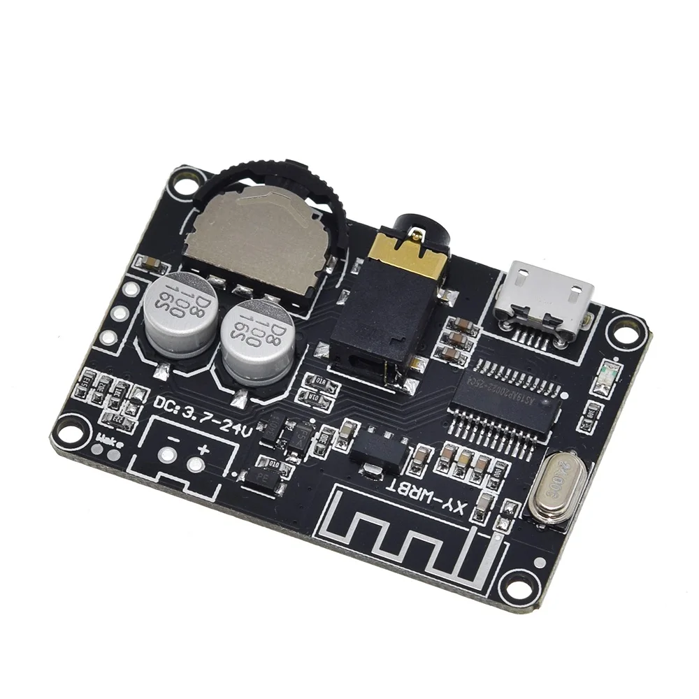 Experience seamless wireless audio with this Bluetooth 5.0 receiver module, supporting lossless MP3 decoding and functioning as a stereo music module. Designed for easy integration, it operates on a voltage range of 3.7V to 24V DC and withstands temperatures from -40°C to +85°C, making it ideal for MP3/MP4 players and sensor applications with STM microcontrollers. Available as a DIY kit in options of 1 or 3 pieces, this sleek, black rectangular module features a silver oval crystal oscillator, electrolytic capacitors, and a compact Bluetooth controller. Its minimalist, industrial aesthetic offers both functionality and a modern, technical look, perfect for custom electronic projects.
