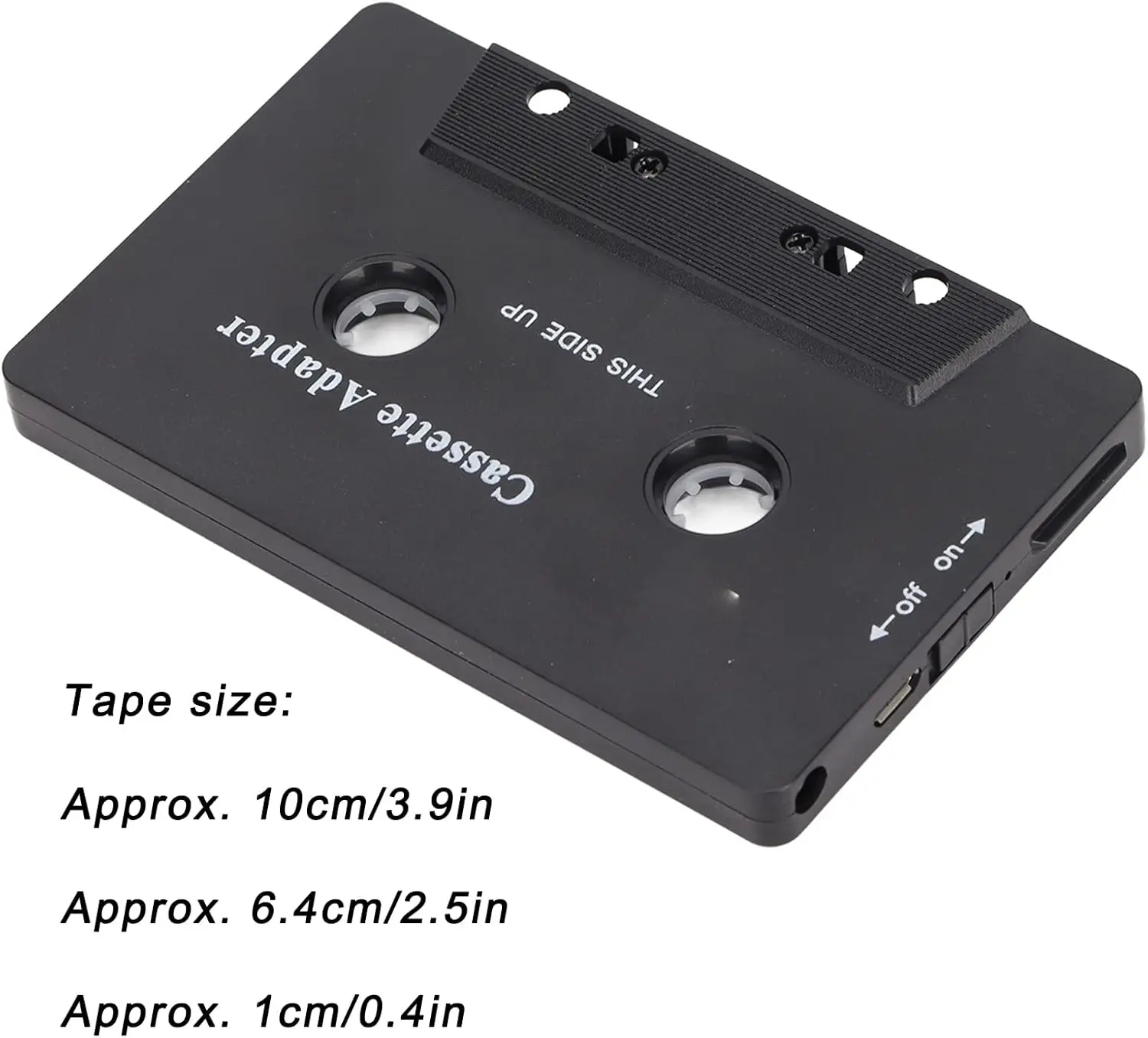 Enhance your car or tablet audio experience with this sleek black Bluetooth cassette adapter, measuring approximately 10 x 6.4 x 1 cm. Crafted from durable ABS material, it features a 300mAh lithium battery for wireless streaming via Bluetooth v5.0. The adapter supports dual sound tracks for richer audio, connects easily through a USB power interface, and is compatible with various car and tablet audio devices. Its minimalist design includes subtle textured details like small round holes and a ribbed protrusion, ensuring straightforward operation. Certified by CE and FCC, this multifunctional, easy-to-use cassette adapter transforms your older stereo system into a modern wireless audio hub.