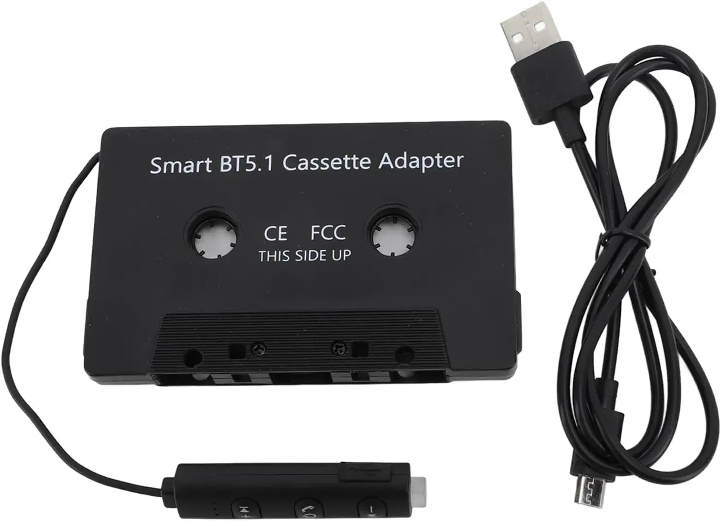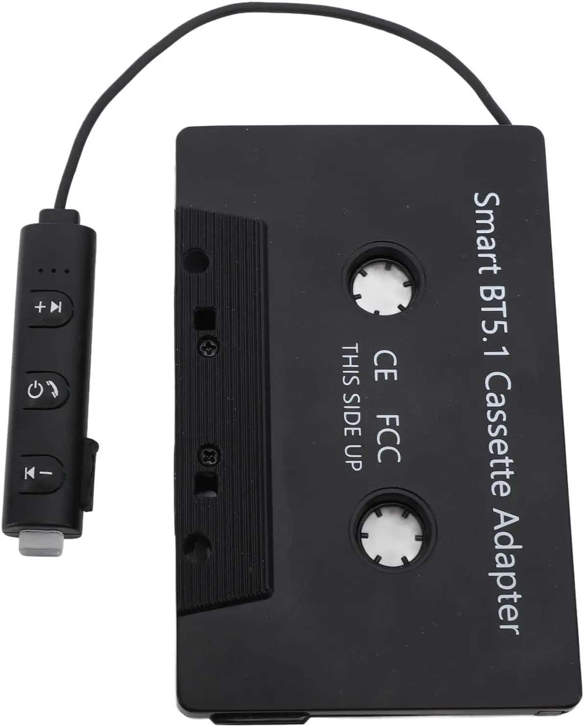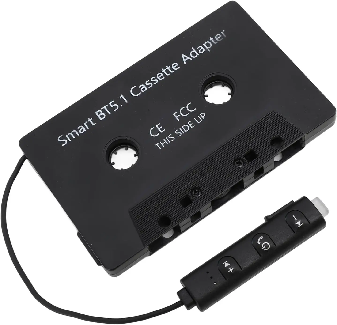 Experience seamless wireless music streaming with this sleek black Bluetooth cassette adapter, model CX007, featuring a minimalist design with a matte finish and subtle ridges along the edges. Operating with Bluetooth v5.1, it offers a noise ratio of over 90dB for high-quality sound. The device includes a built-in CR1220 40mAh battery, pre-installed for immediate use, with an external charging structure for continuous playback and intelligent low power detection with an alarm alert. Compatible with all cars and trucks equipped with cassette players, its simple design and intuitive remote control make it easy to use, ensuring a modern and reliable audio experience.