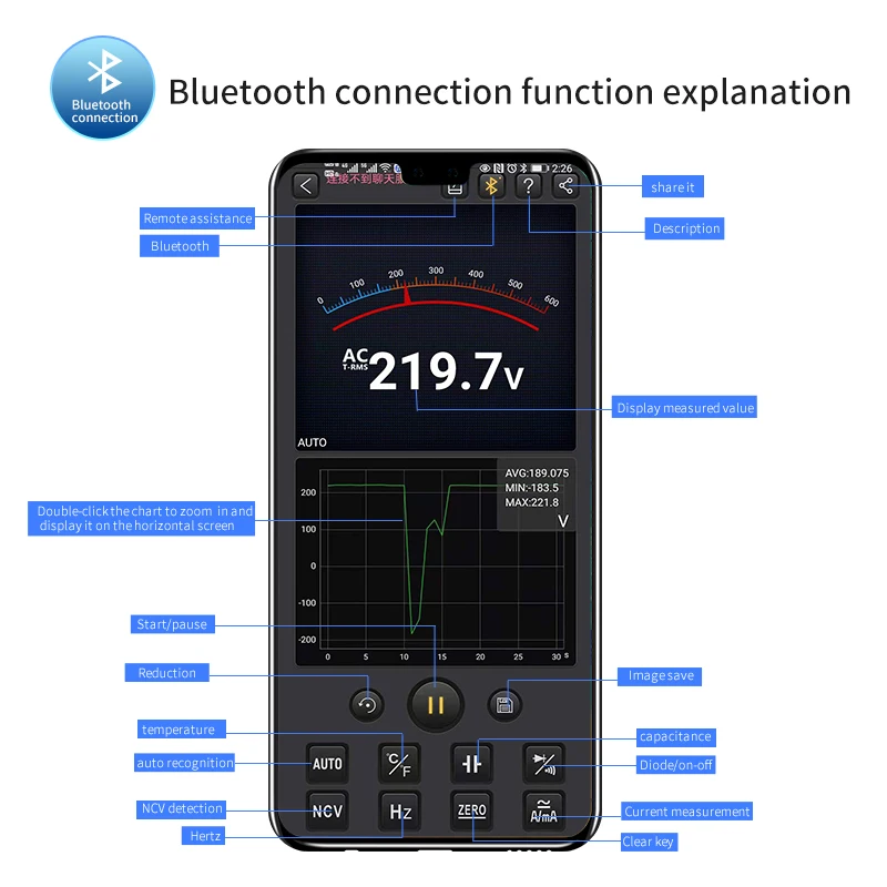 Enhance your toolkit with this advanced multimeter that combines technical excellence with user-friendly features. Whether you're troubleshooting electrical systems or conducting detailed measurements, this device offers reliability, versatility, and convenience. Its Bluetooth capability allows seamless data transfer, making your work more efficient. With its robust design, clear display, and comprehensive measurement functions, this multimeter is designed to support your professional needs. Invest in this cutting-edge instrument today and experience precision and ease in every test and measurement task.