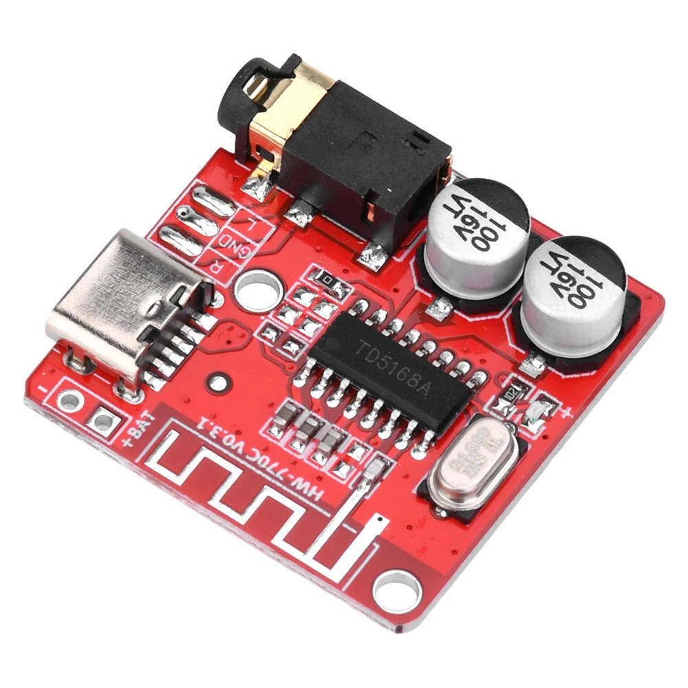 Experience seamless wireless audio with this this 3W car-mounted Bluetooth decoder board. Designed for easy installation and versatile use, it offers high-quality sound output, supporting Bluetooth 5.1 protocols for stable and quick connections. The device features a modern, vibrant red rectangular circuit board with a sleek, minimalist style. Its black integrated circuit and gold connectors provide striking contrast, while silver electrolytic capacitors add subtle metallic accents. Equipped with a Type-C interface for flexible power options, it’s perfect for upgrading your vehicle’s audio system or enhancing your home audio setup. The small, efficient design ensures it fits effortlessly into your existing electronic projects, making it ideal for DIY enthusiasts and car audio enthusiasts aiming for crisp, high-fidelity playback.