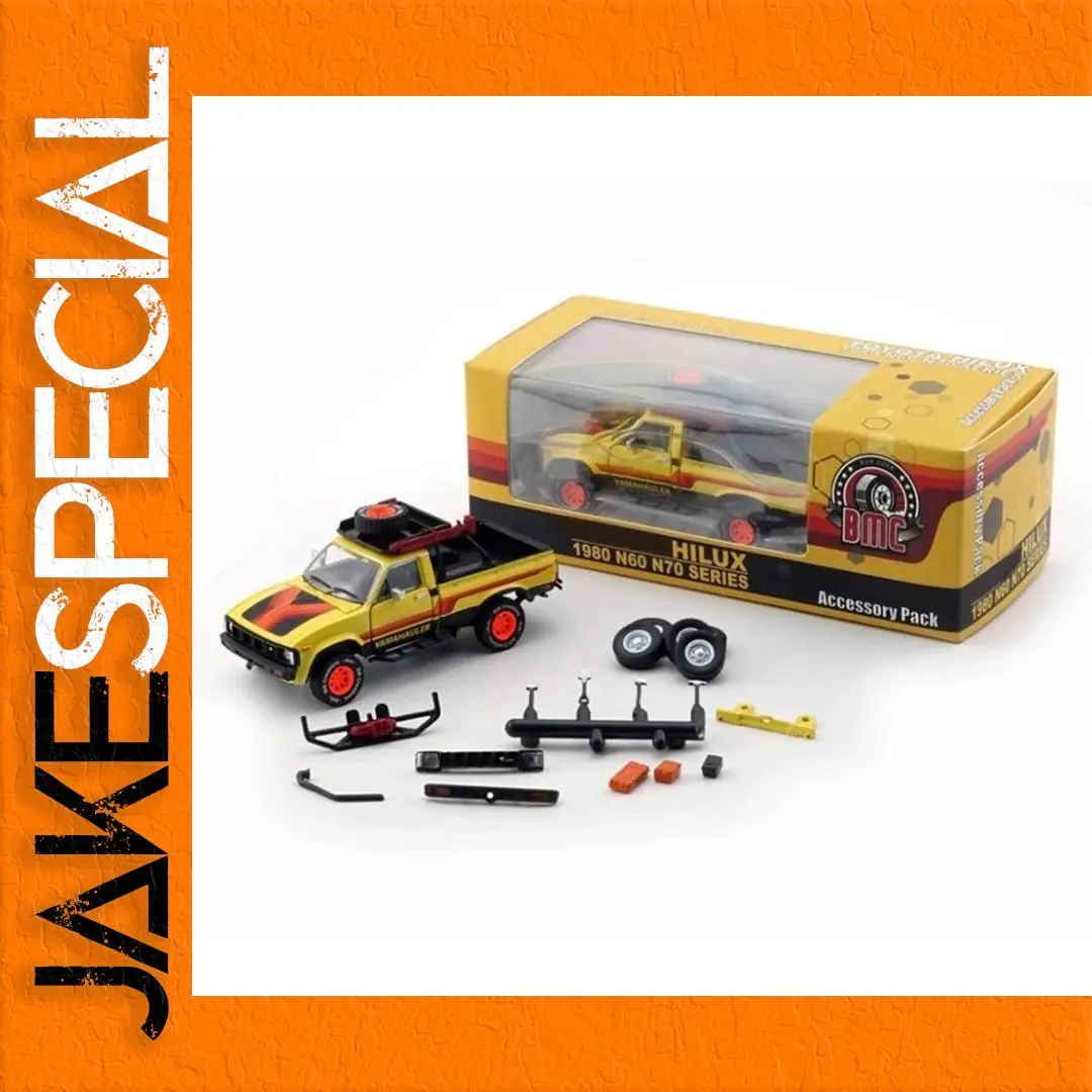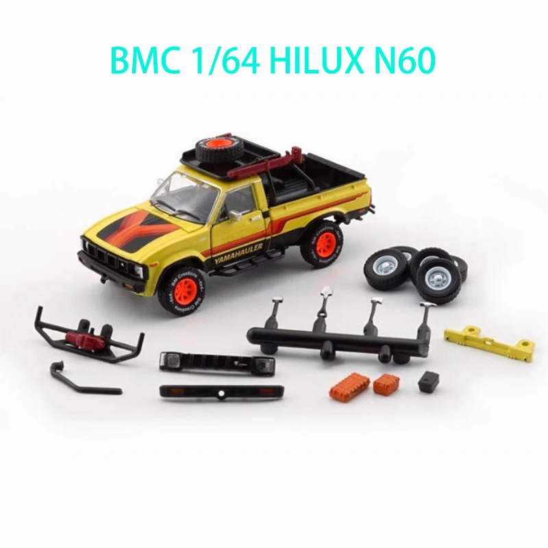 Experience the thrill of the open road with the BMC 1/64 HILUX N60 diecast model. This stunning diecast representation features a lively yellow body adorned with striking red and black racing stripes that grab attention. The intricate front grill, complete with black accents, and the practical black rooftop accessory add to its charm. Its vibrant orange wheels create a sporty contrast, enhancing its visual appeal. Perfect for display, this model showcases your passion for automotive excellence, making it a must-have for collectors and enthusiasts alike.