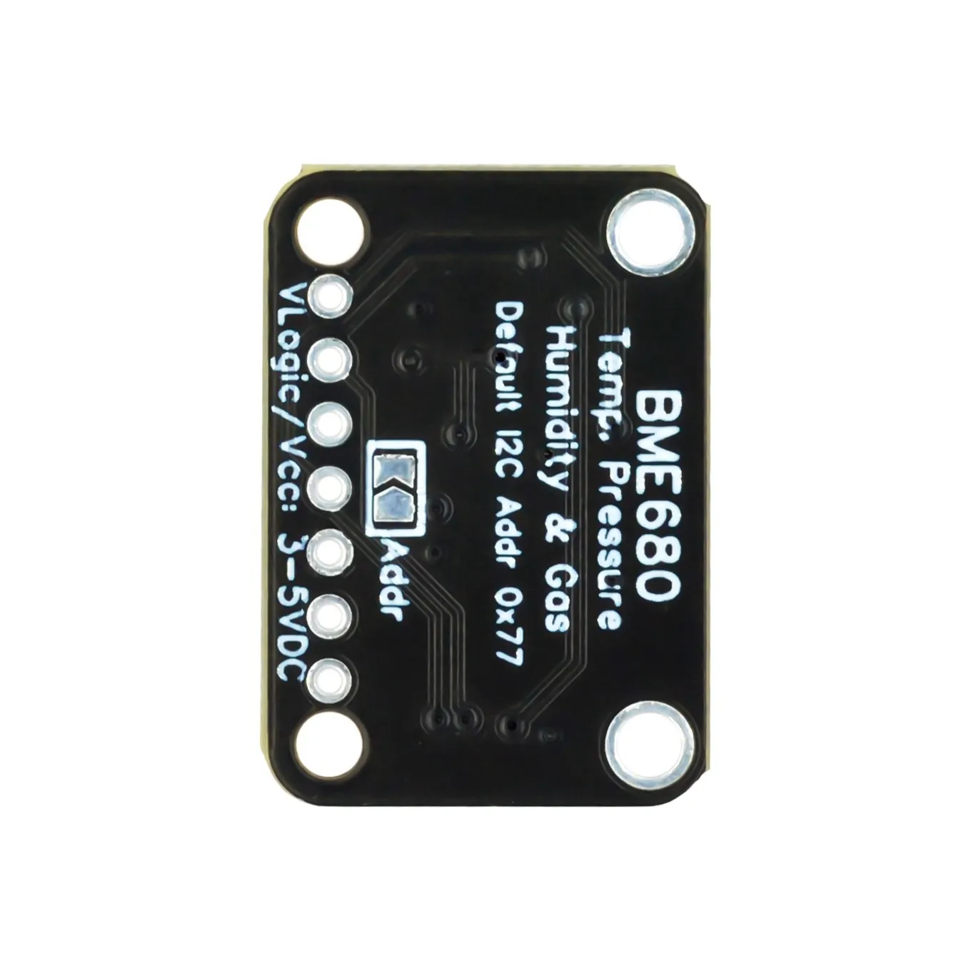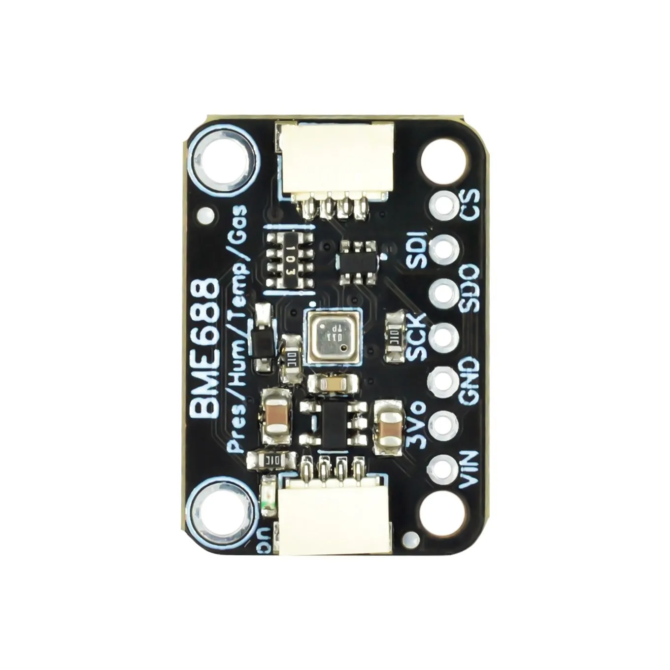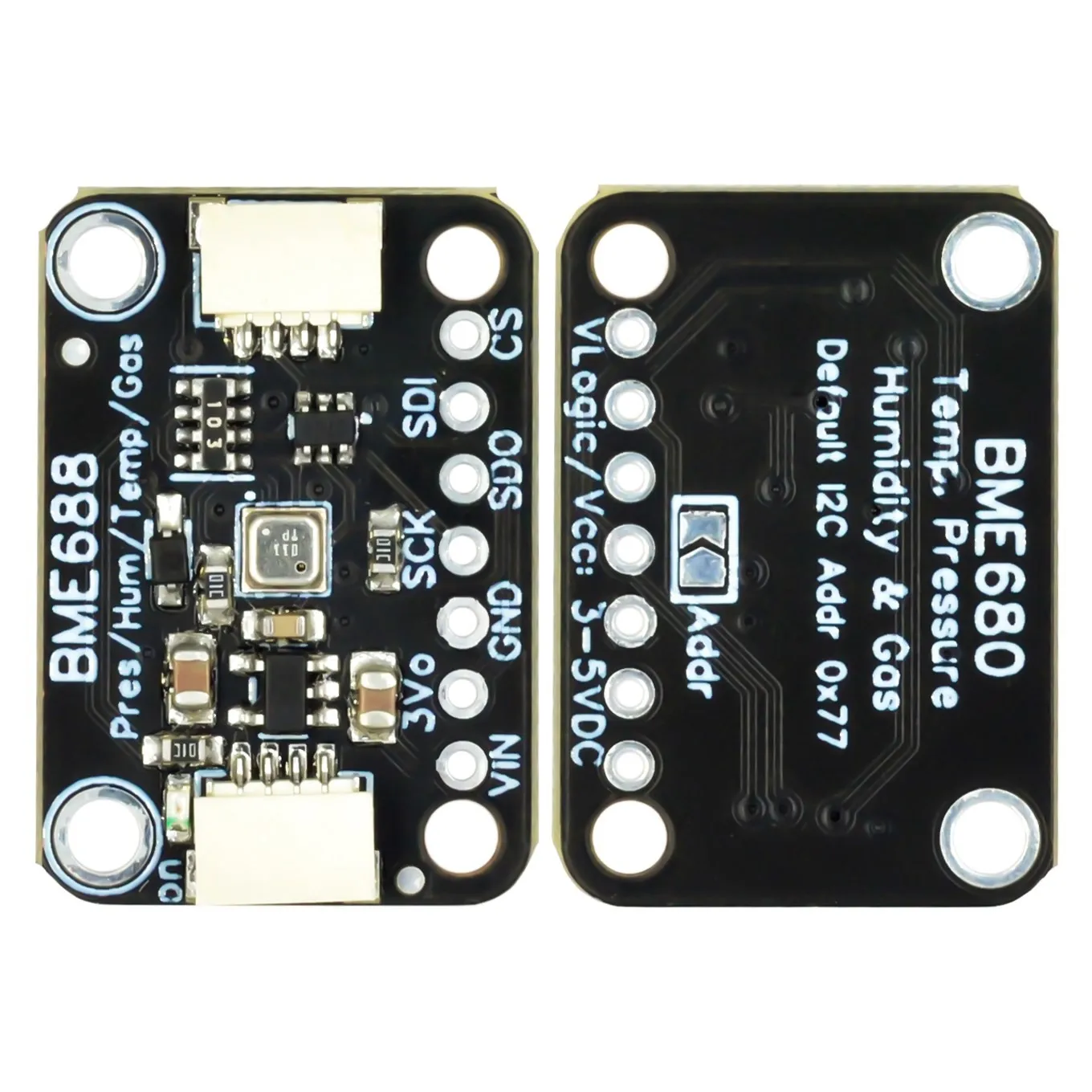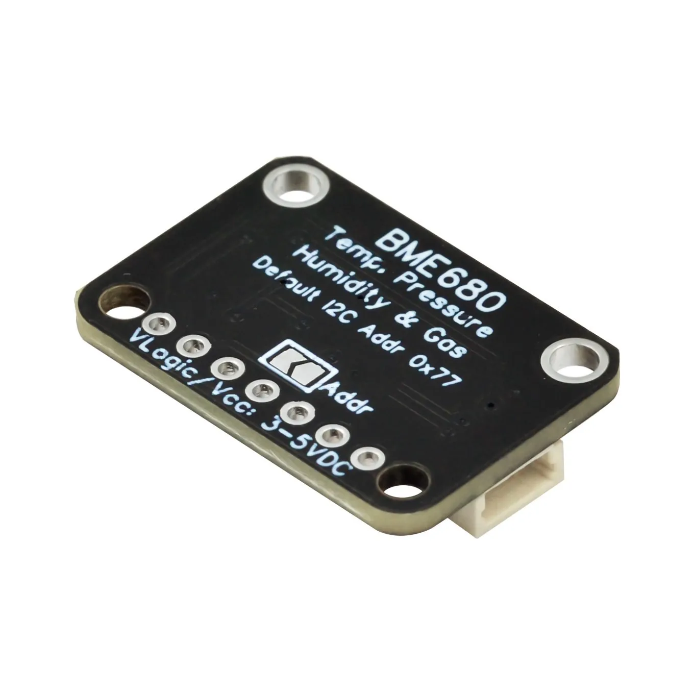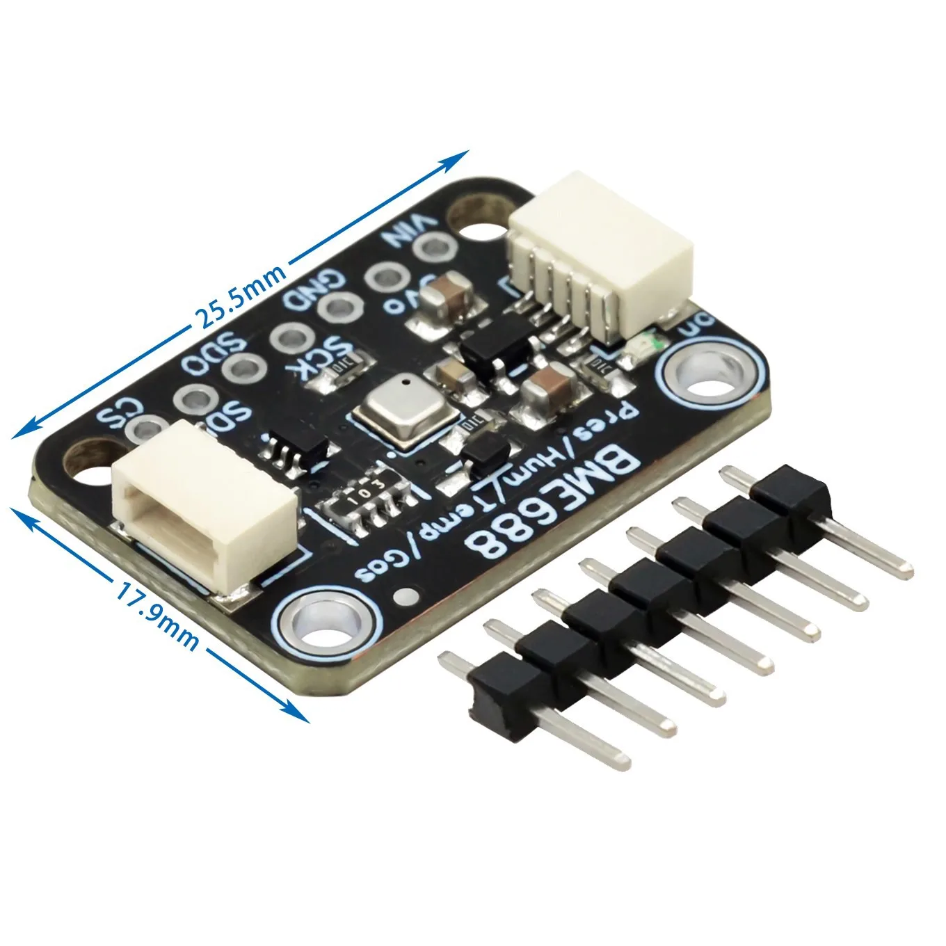 The BME688 Environment Sensor Module features a compact MEMS sensor supporting wide input voltage ranges of 3.3V to 5.0V, offering highly reliable and low power consumption performance. It measures temperature from -40°C to +85°C with ±1.0°C accuracy, humidity from 0-100% RH with ±3% accuracy at 25°C, and air pressure from 300 to 1100 hPa with ±0.6 hPa accuracy. The sensor also monitors VOC levels in the 0-500 range, providing comprehensive air quality data. It utilizes a plug-and-play gravity I2C interface, suitable for seamless integration into environmental monitoring systems, with an optional SPI expansion interface, and operates at a typical current of 5mA (up to 25mA during VOC measurement).
