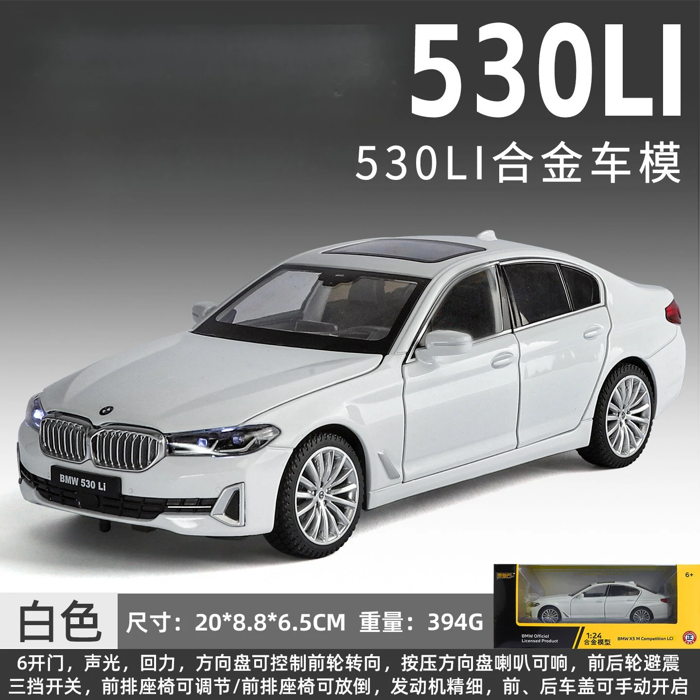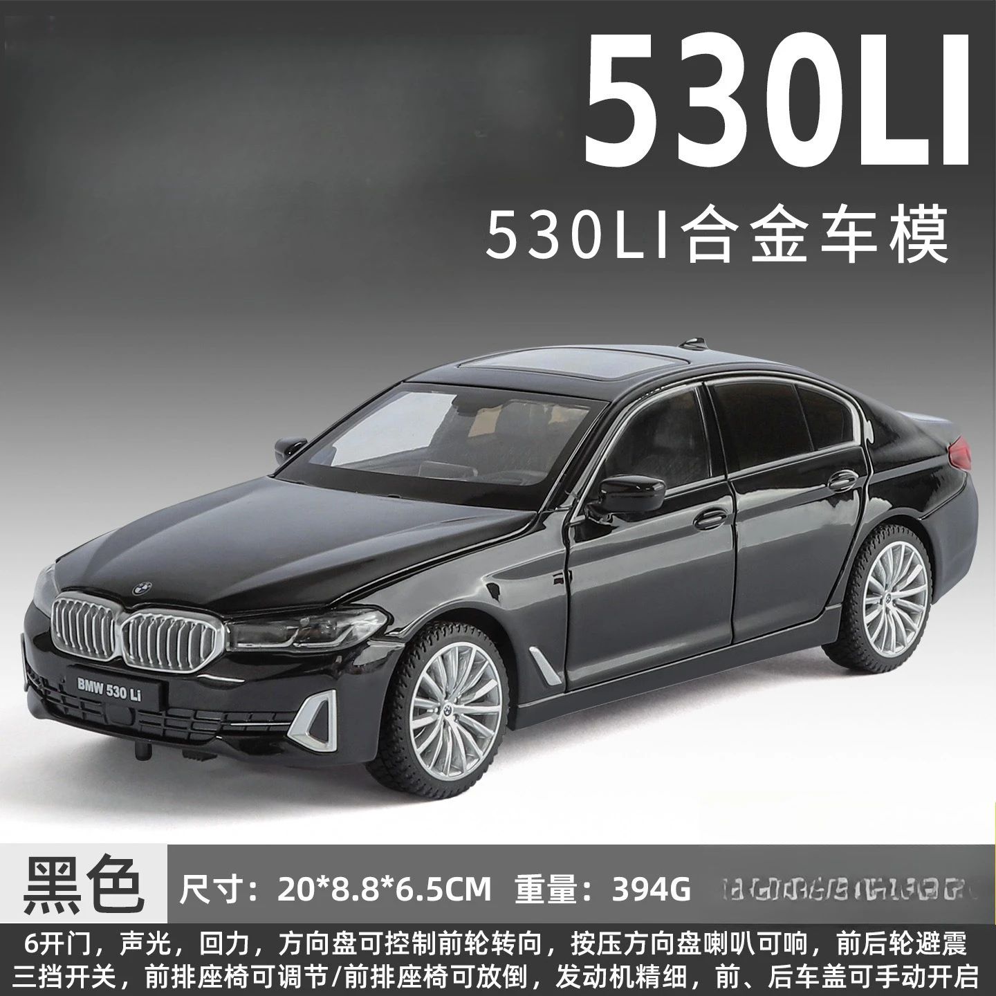 This stunning 1:24 scale diecast model of the BMW 530Li luxury sedan embodies elegance and sleek design. Crafted from high-quality metal, it features a striking glossy black finish that enhances its luxurious appearance. Its exterior showcases the iconic BMW kidney grille, meticulously chrome-plated for an upscale look. The model's aerodynamic curves and realistic details such as door handles, side mirrors, and finely designed multi-spoke wheels offer an authentic presentation. Brightly designed tail lights with red accents contrast beautifully against the black body, making this model ideal for collectors or as a stylish desktop decoration.