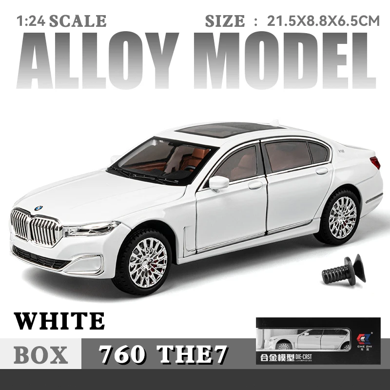 This highly detailed 1/24 scale diecast model of a BMW 760li showcases a sleek, modern design with a pristine white finish, chrome accents, and intricate multi-spoke alloy rims with black tires. Made from metal with no chemicals used, it features authentic body contours, narrow LED-style headlights with clear covers, and carefully crafted door handles and side mirrors. Suitable for collectors aged 18 and above, it offers a sophisticated decorative piece for home or interior display. Available in black, grey, and white options, and CE certified, this premium model combines craftsmanship and elegance, perfect for enhancing any luxury collection or interior decor.