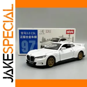 The BMW CSL 3.0 diecast model car, crafted in a 1:42 scale, showcases an alluring design with a sleek, bright white body that embodies a perfect blend of sportiness and elegance. Featuring stunning gold alloy wheels, intricate details such as the iconic BMW kidney grille, and realistic headlights, this model is a true collector's item. A black badge boldly displaying “BMW 3.0 CSL” adds a touch of authenticity. Furthermore, its aerodynamic features like a rear wing and side vents highlight its racing background, making it a wonderful addition to any display collection.