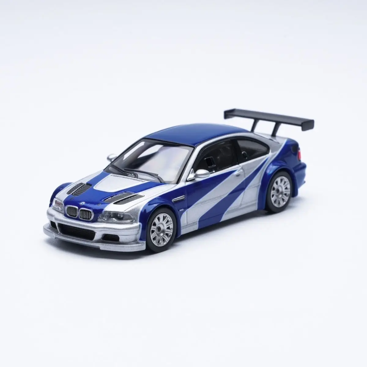 Imagine owning this beautifully crafted diecast model of the BMW E46 M3 GTR, perfectly capturing its sleek, race-inspired design. The model boasts a striking metallic silver finish with vibrant blue racing stripes that flow from the front to the rear, creating an energetic visual impact. Black vent details on the hood add an aggressive touch, complemented by a large rear wing spoiler mounted on sturdy supports, giving it a dynamic, aerodynamic stance. The finely detailed alloy rims with black tires mirror the actual vehicle’s sporty look. This miniature replica features precise headlight lenses made of clear plastic, emphasizing craftsmanship. Its overall aerodynamic contours, lowered profile, and wide body evoke a real racing car. Display this model proudly in your collection or home decor for a touch of automotive excellence.