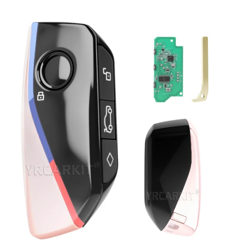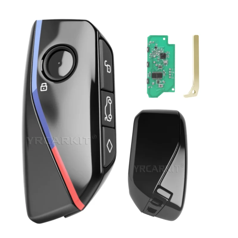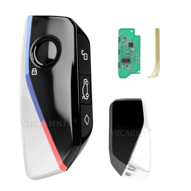 Experience seamless access with this upgraded BMW F chassis remote key fob, designed for luxury and functionality. Crafted with a sleek, black matte finish, it features minimalist circular and rectangular buttons for locking, unlocking, and trunk release. Accented by vibrant red or blue vertical stripes, each model emphasizes high-tech elegance. The silver and black version with a stylized BMW logo adds a touch of sophistication. Compatible with BMW 1 Series, 2 Series, 3 Series/GT, 4 Series, 5 Series, 6 Series/M6, 7 Series, X3, X4, M2, M3, and M4 models manufactured from 2009 to 2019, it boasts frequencies of 315, 434, and 868 MHz. Its integrated PCF7945 / ID49 chip ensures reliable performance, suited for advanced immobilizer systems. Upgrade your vehicle’s security and access convenience today.