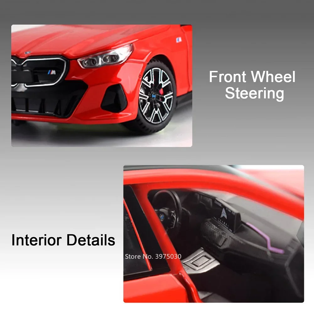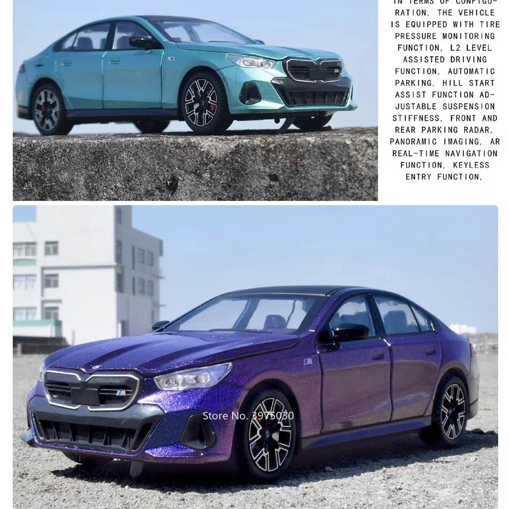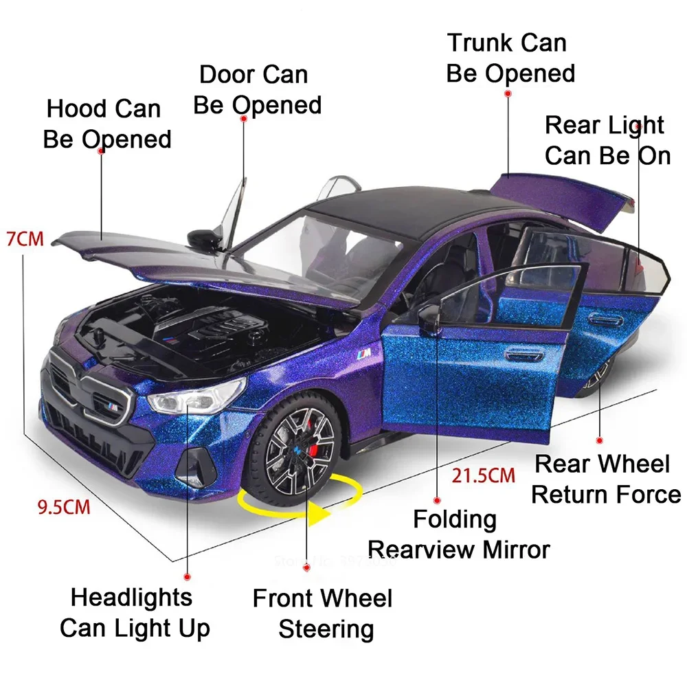 Experience the thrill of owning this meticulously crafted BMW I5M60 miniature, designed to captivate car enthusiasts and collectors alike. Crafted from zinc metal with a durable plastic chassis and rubber tires, this 1:24 scale high-fidelity model replicates the powerful presence of the original. Its glossy finish and sharp details, including a streamlined body, sharp grille, and narrow headlights, showcase modern sporty aesthetics. The model features six doors that open smoothly, along with functional LED lights and sound effects, creating an engaging display. Equipped with a pull-back mechanism, it moves effortlessly, further enhancing the realism. Perfect for display or play, this model combines craftsmanship with fun. A true testament to automotive design, crafted for enthusiasts and collectors seeking quality and authenticity.