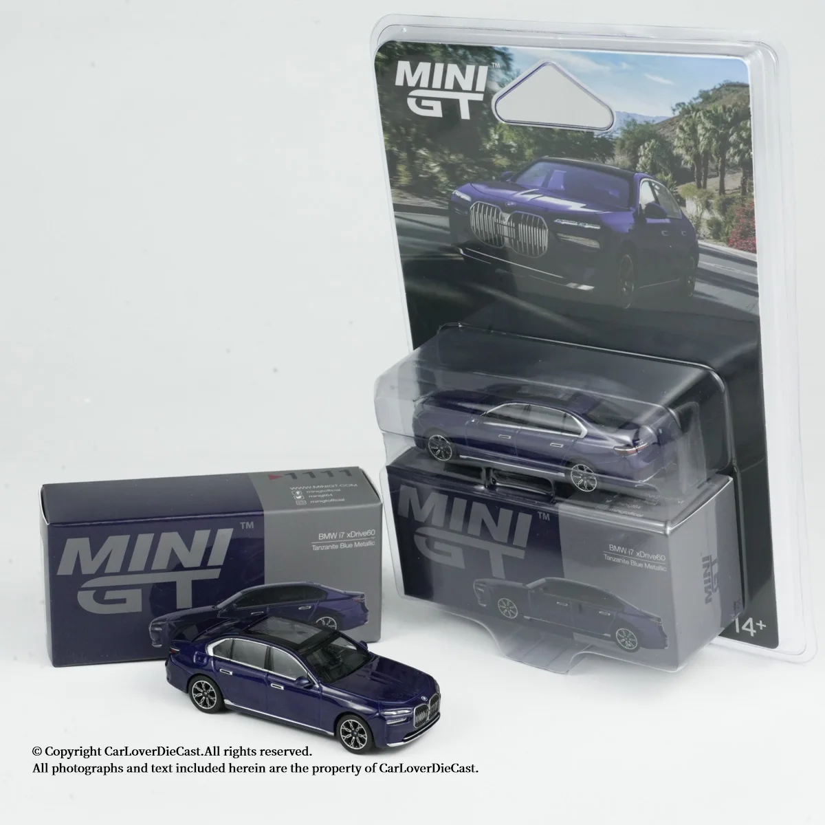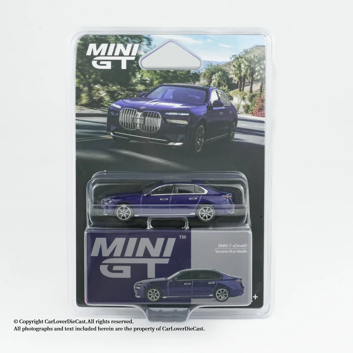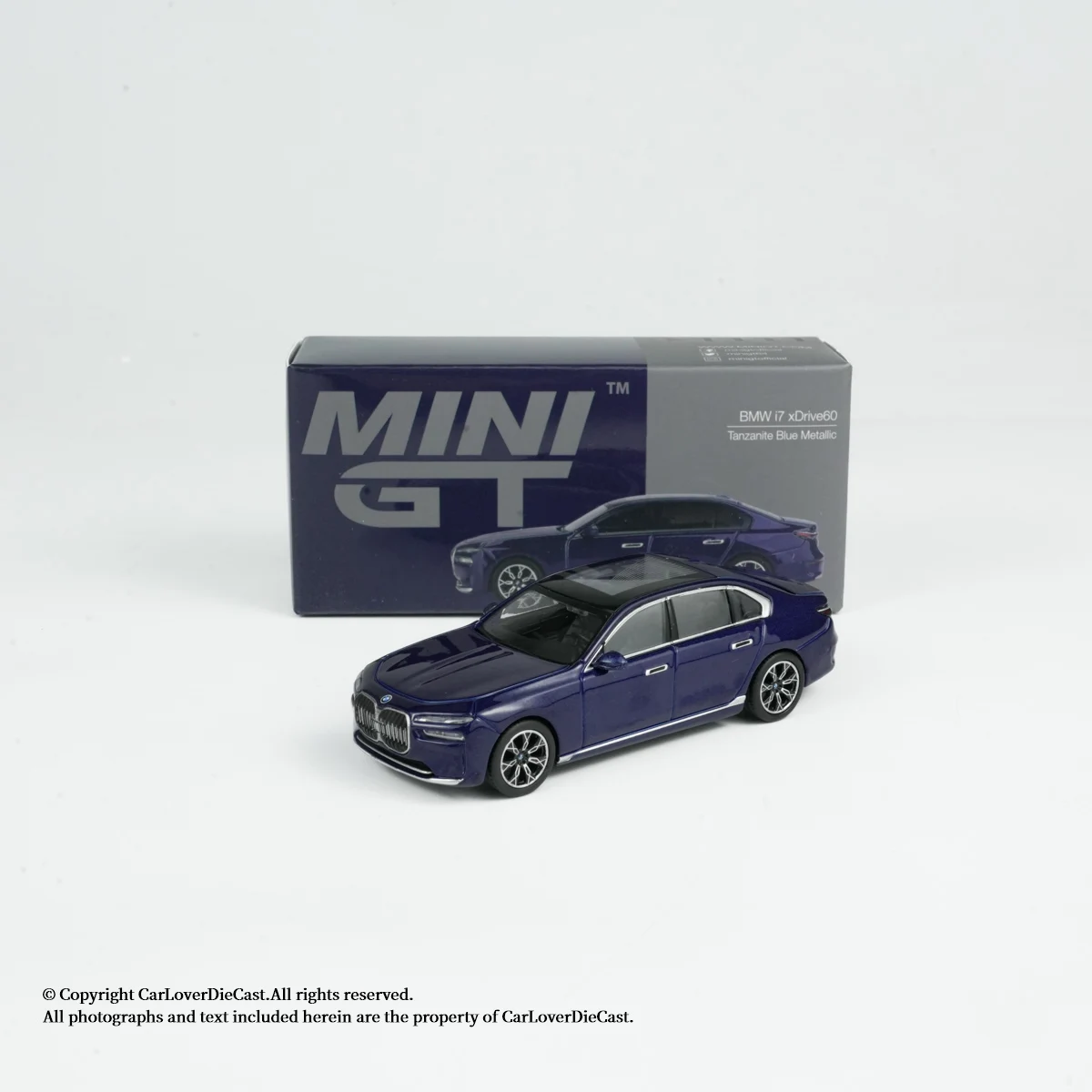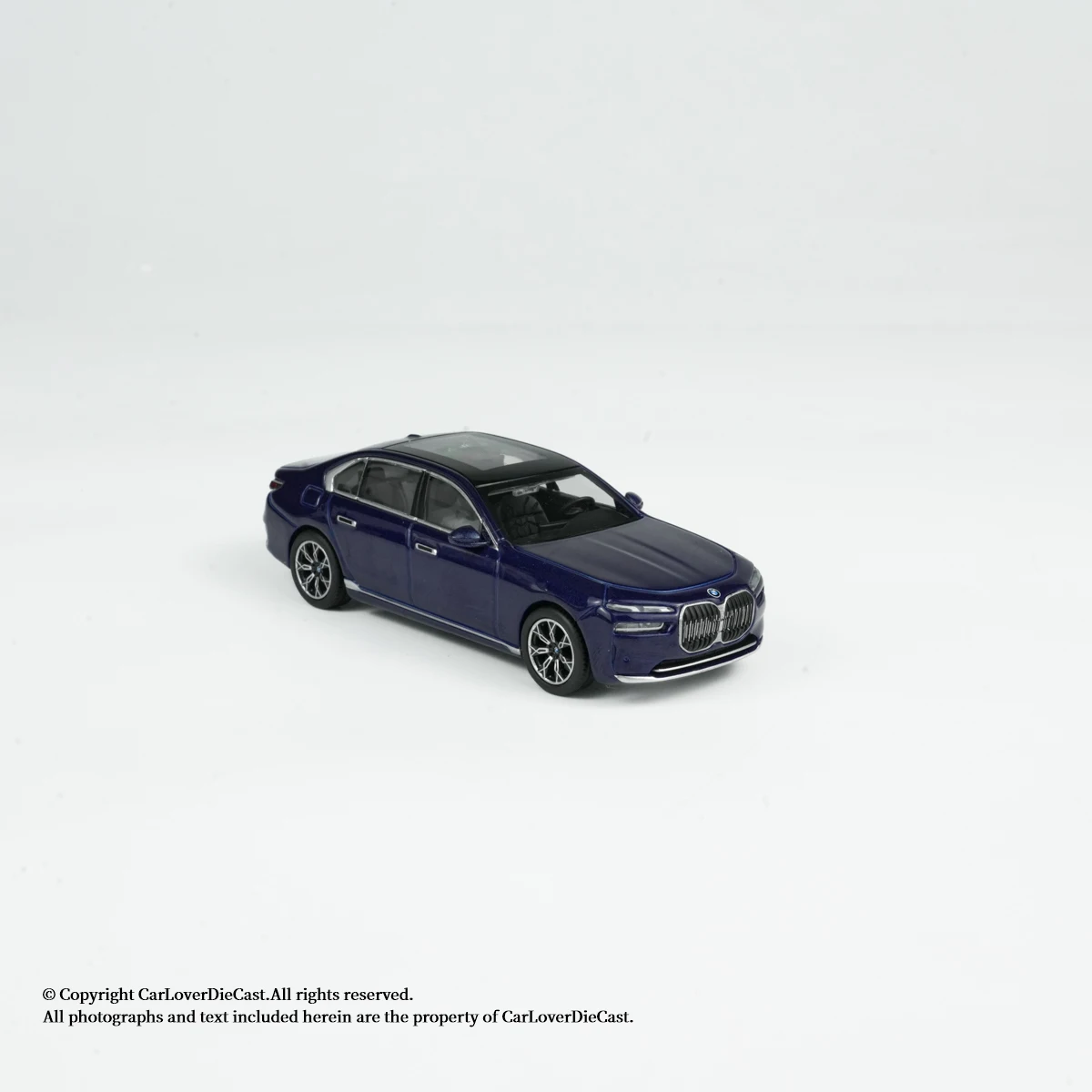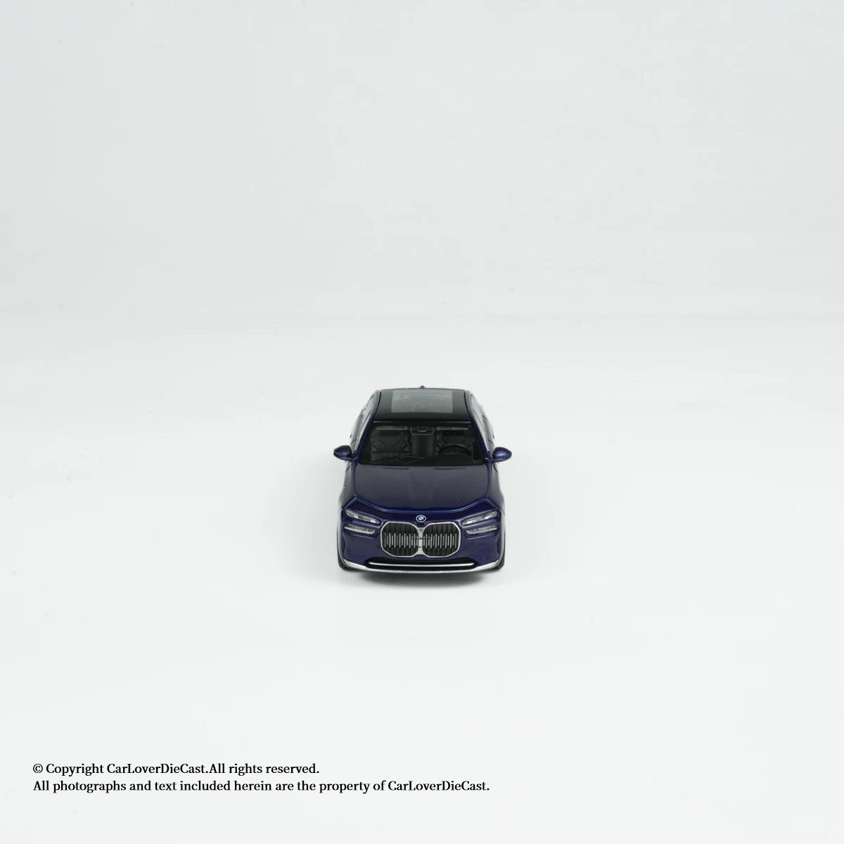 Step into a world of luxury with this premium diecast miniature of the BMW I7 XDrive60, finished in stunning Tanzanite Blue Metallic. Crafted with meticulous attention to detail, this 1:64 scale model exudes sophistication and realism. Its glossy, metallic sheen captures light beautifully, emphasizing the sleek contours and modern design of the full-sized vehicle. The precise features include a signature kidney grille, sharply defined headlights, and silver-spoked rims, all faithfully reproduced to reflect the elegance of the original. Transparent windows reveal a finely detailed interior, making this model an impressive collector's item. Whether displayed on your desk or in your collection, it brings a touch of automotive excellence into your space.