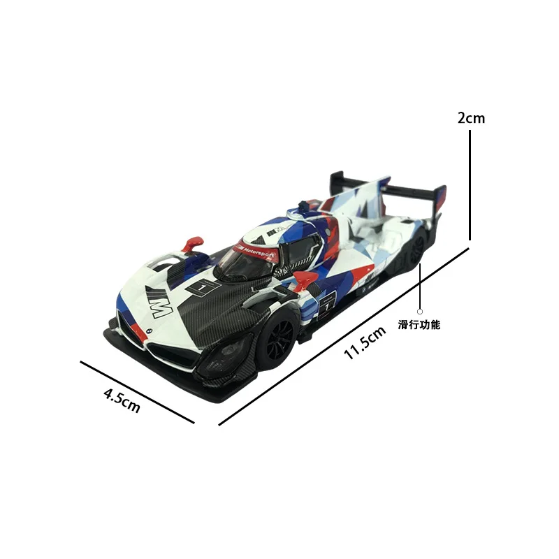 Step into the world of high-performance racing with this highly detailed miniature of the BMW M Hybrid V8, crafted in a bold blue color. Measuring at a precise 1:45 scale, this alloy and plastic model captures the sleek, aerodynamic shape of the full-sized race car, highlighting sharp lines, flowing contours, and intricate vents. Its low-profile silhouette, complemented by a prominent rear wing and unique graphics, brings racing excitement to your collection or display space. The transparent windows reveal a finely detailed interior, giving the model a realistic touch. Perfect for enthusiasts and collectors, this miniature showcases technical precision and sporty aesthetics, making it an ideal gift or display piece that emphasizes speed and style.