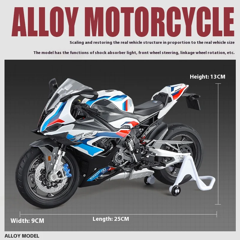 Experience the exhilarating world of high-performance motorcycles with this phenomenal 1:9 scale diecast model motorcycle, featuring the iconic BMW M1000RR and S1000RR. Crafted from high-quality metal, this model boasts a striking predominantly white body adorned with dynamic blue and red accents, showcasing an aggressive design that reflects the essence of racing heritage. The intricate detailing of the wheels, including brake discs and calipers, captures the realism enthusiasts will love. With its streamlined seat and aerodynamic front fairing, this model promises to elevate your collection, making it a perfect gift for anyone passionate about racing or collectible vehicles.