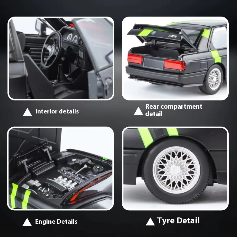 - Scaled at 1:24, accurately representing the classic BMW M3 E30 from 1987 with fine craftsmanship.