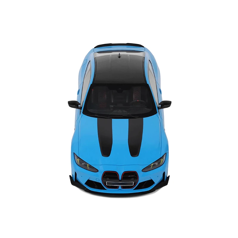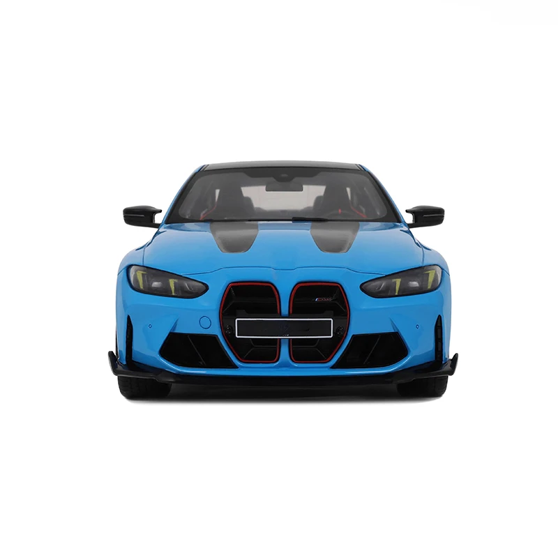 Experience the thrill of owning this meticulously crafted 1:18 scale die-cast resin model of the BMW M4 CS, part of the 2024 collection. Measuring approximately 26 cm in length and 11 cm in width, this limited-edition piece captures the sporty elegance of the real vehicle with incredible detail. The vibrant blue paintwork is complemented by contrasting black accents, including the hood, roof, side mirrors, and wheels, creating a modern, aggressive aesthetic. The front boasts a distinctive kidney grille outlined in bold red trim, flanked by sharp, angular headlights with integrated LED daytime running lights. The contoured lines and sleek profile evoke motion and performance, making this model a perfect addition for any collector or enthusiast.