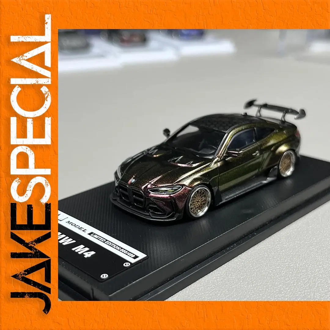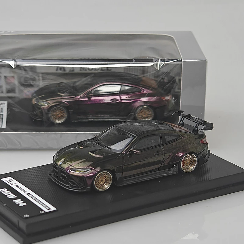 This exquisite 1:64 scale diecast model car replicates the iconic BMW M4 with a captivating metallic finish that transitions from purple to gold. The glossy paint reflects light beautifully, enhancing the car's sleek and aerodynamic design, which is typical of high-performance sports cars. It features a distinctive front grille with a prominent logo, streamlined headlights, and a sculpted roofline that adds to its allure. Each detail, from the intricate gold-colored mesh design of the alloy wheels to the sporty rear wing, showcases the meticulous craftsmanship aimed at collectors and enthusiasts alike.