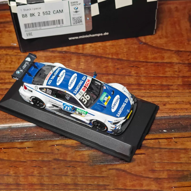 Experience the thrill of racing from the comfort of your display with this meticulously crafted 1/43 scale diecast model of the 2016 BMW M4 DTM (F82) RBM 36#. Designed with a sleek aerodynamic profile, the model boasts a glossy white finish accented by vibrant blue details that highlight the car's sporty nature. Every line, decal, and sponsor logo, including Samsung SOl, Bosch, and DEKRA, has been precisely applied to create a highly detailed and realistic appearance. The transparent windows reveal a simplified yet authentic interior, while features like the front splitter, rear wing, and detailed black-rimmed wheels enhance its dynamic look. This collectible piece captures the essence of high-performance racing in a compact form perfect for display.