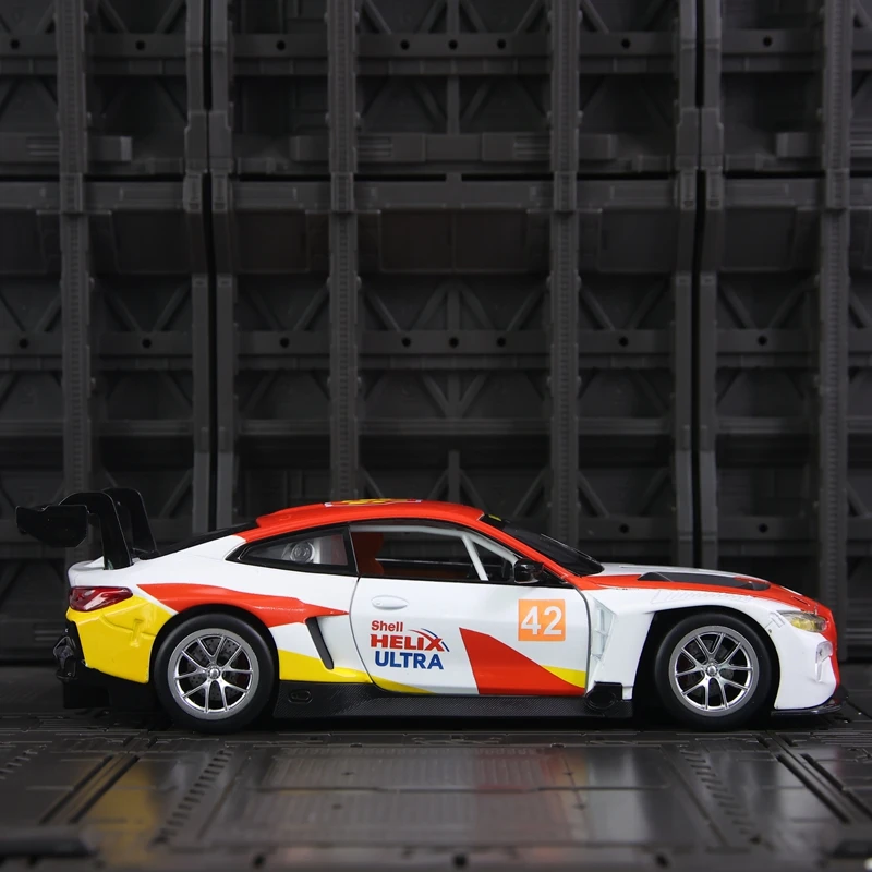 Experience the thrill of racing with this highly detailed 1:24 scale diecast alloy BMW M4 GT3 car model by CCA. Crafted from durable metal, it captures every aerodynamic curve and decal with precision. The sleek white finish is complemented by vibrant red, yellow, and black accents, including the iconic Shell Helix Ultra logos and the distinctive racing number '42' in an orange square. Its functional doors open smoothly to reveal an intricate interior, complete with a racing seat and dashboard. The model also features interactive electronic elements such as sound and light effects, enhancing its realism and playability. Perfect for collectors or young enthusiasts, this compact, energetic replica sparks imagination and admiration alike.