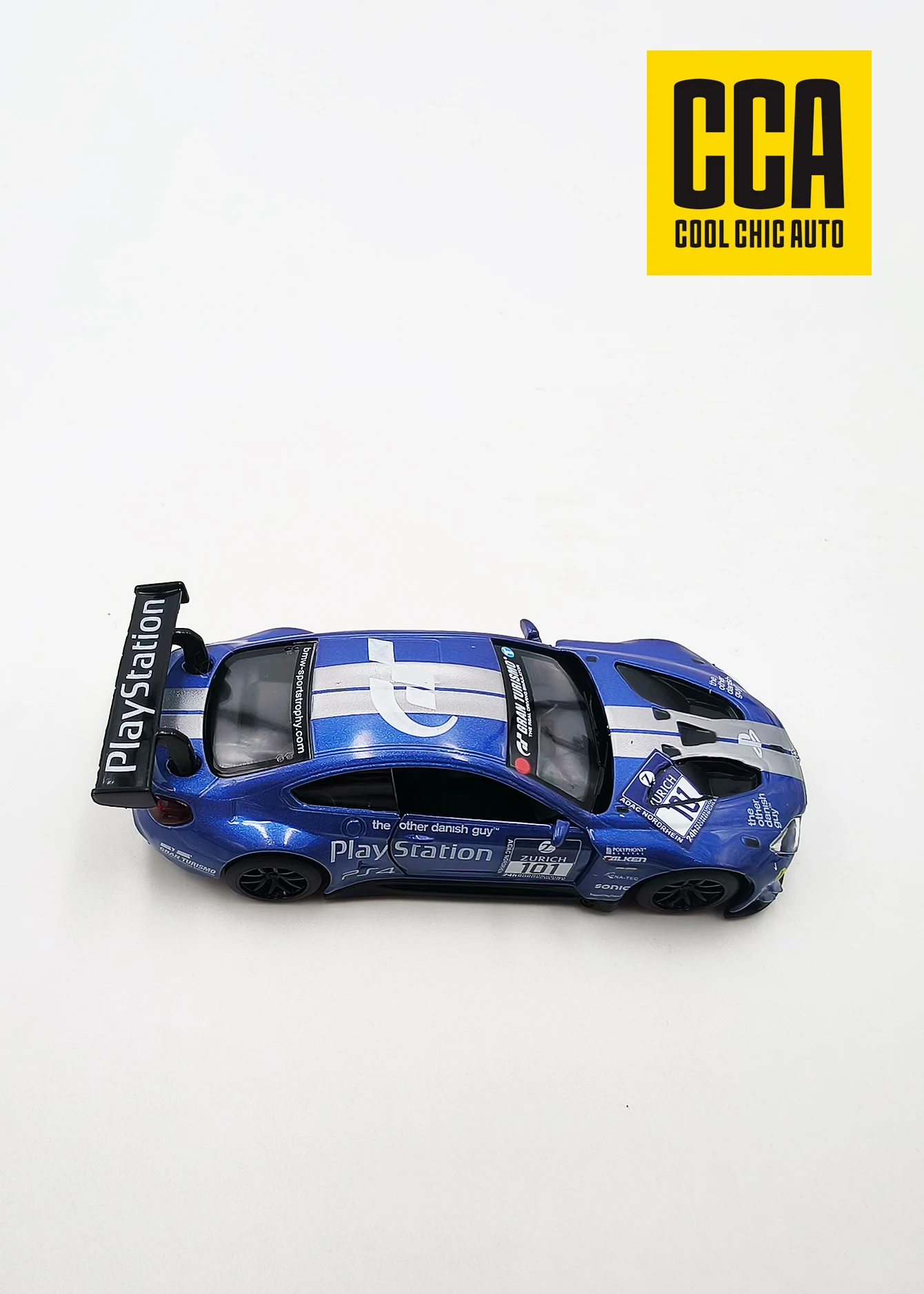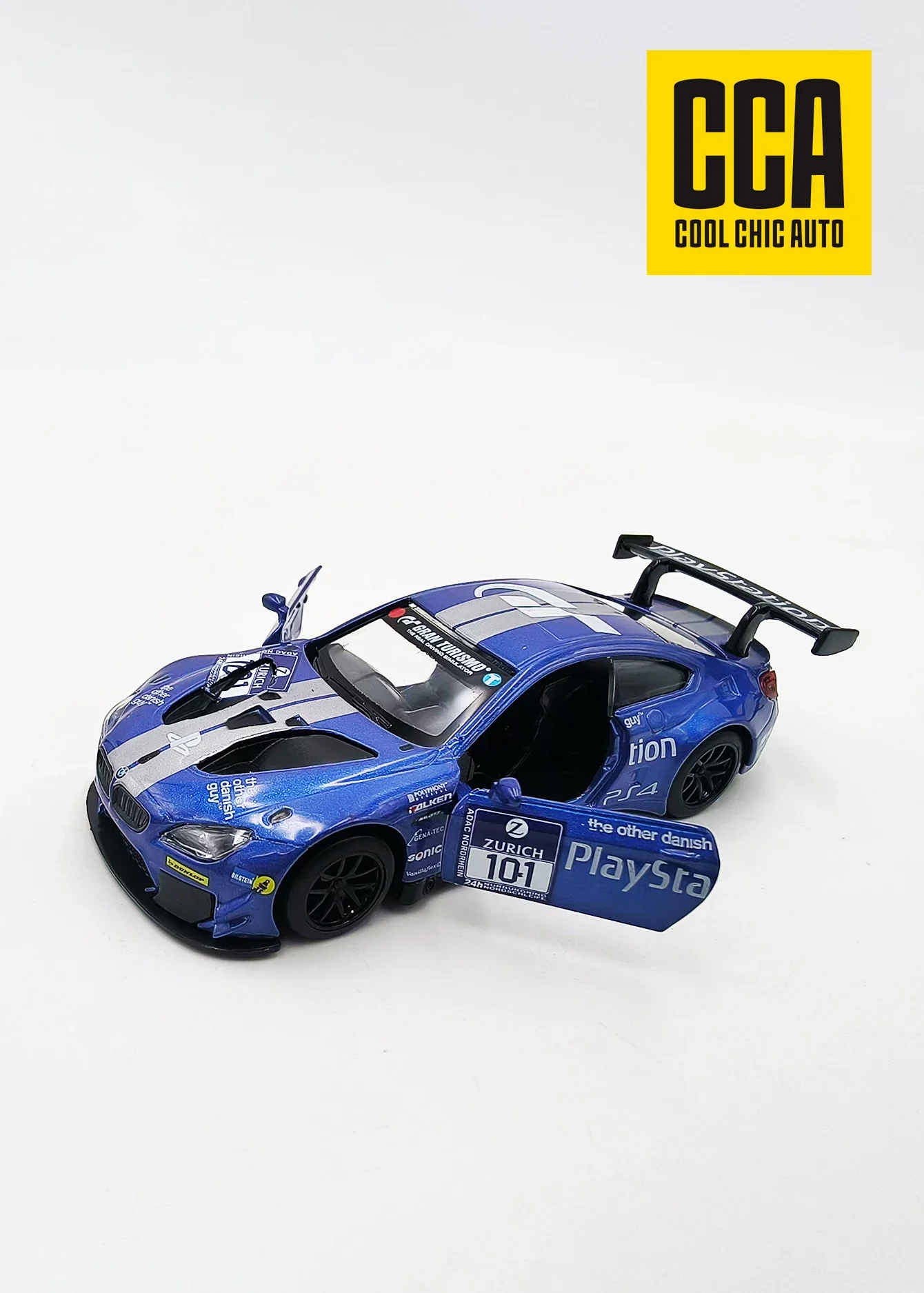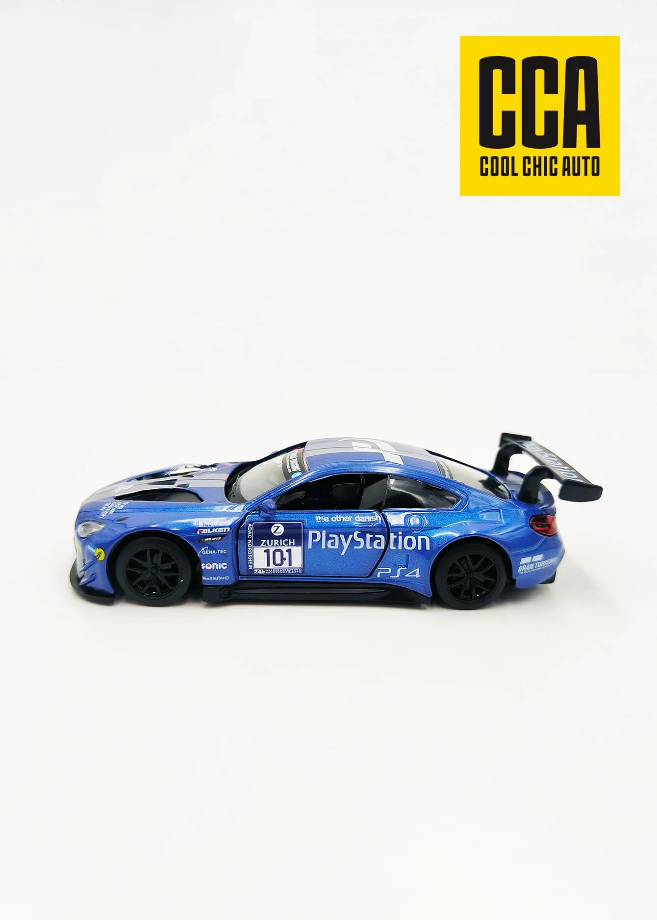 The collectible alloy car model of the BMW M6 GT3 showcases a striking blue glossy finish and intricate details, including a prominent white racing stripe and the “PlayStation” logo on the sides and rear wing. Crafted from durable die-cast material, this fully finished model requires no assembly, making it perfect for display or play. Features include realistically molded headlights, sporty wheels designed to resemble actual racing tires, and a large rear wing highlighting its racing pedigree. This model is ideal for birthdays, holidays, or as a standout decorative ornament for enthusiasts and collectors alike.