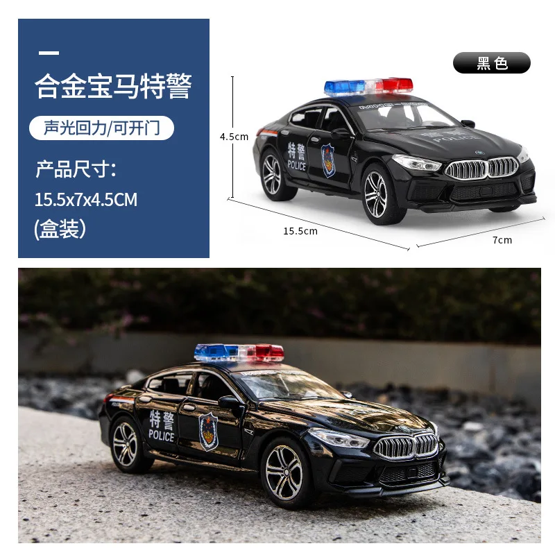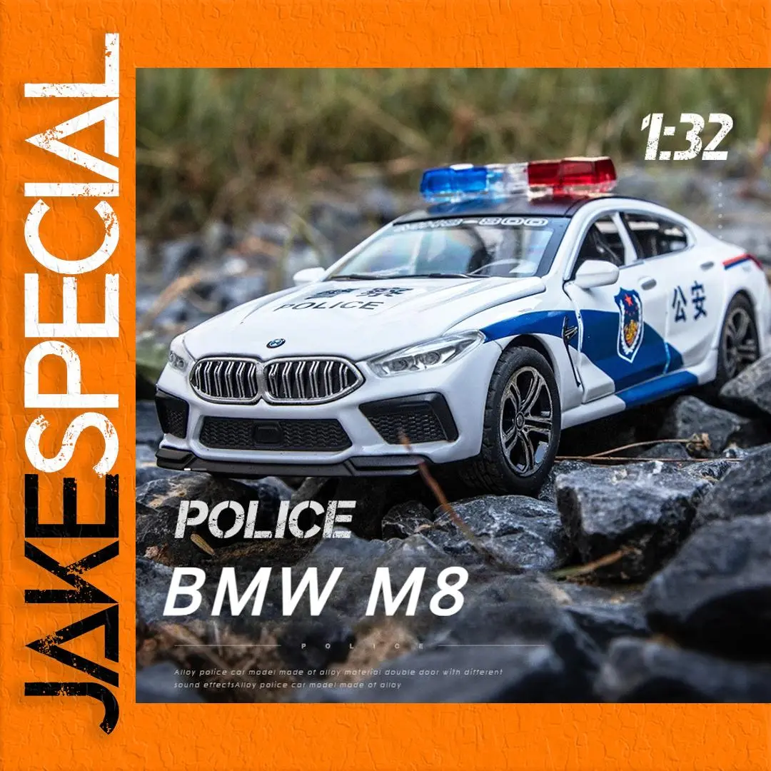 Discover the sleek 1:32 scale BMW M8 Police Car model, expertly crafted from durable diecast metal. This stunning replica showcases a striking white body accentuated by blue and black details, featuring a finely detailed front grille with silver elements. It comes equipped with realistic sound and light functions, operated through an easy pull-back action—no batteries required. The iconic “POLICE” insignia and multi-spoke wheels enhance its sporty look, making it perfect for collectors and enthusiasts alike. With its impressive attention to detail, this model is sure to be a standout piece in any collection.