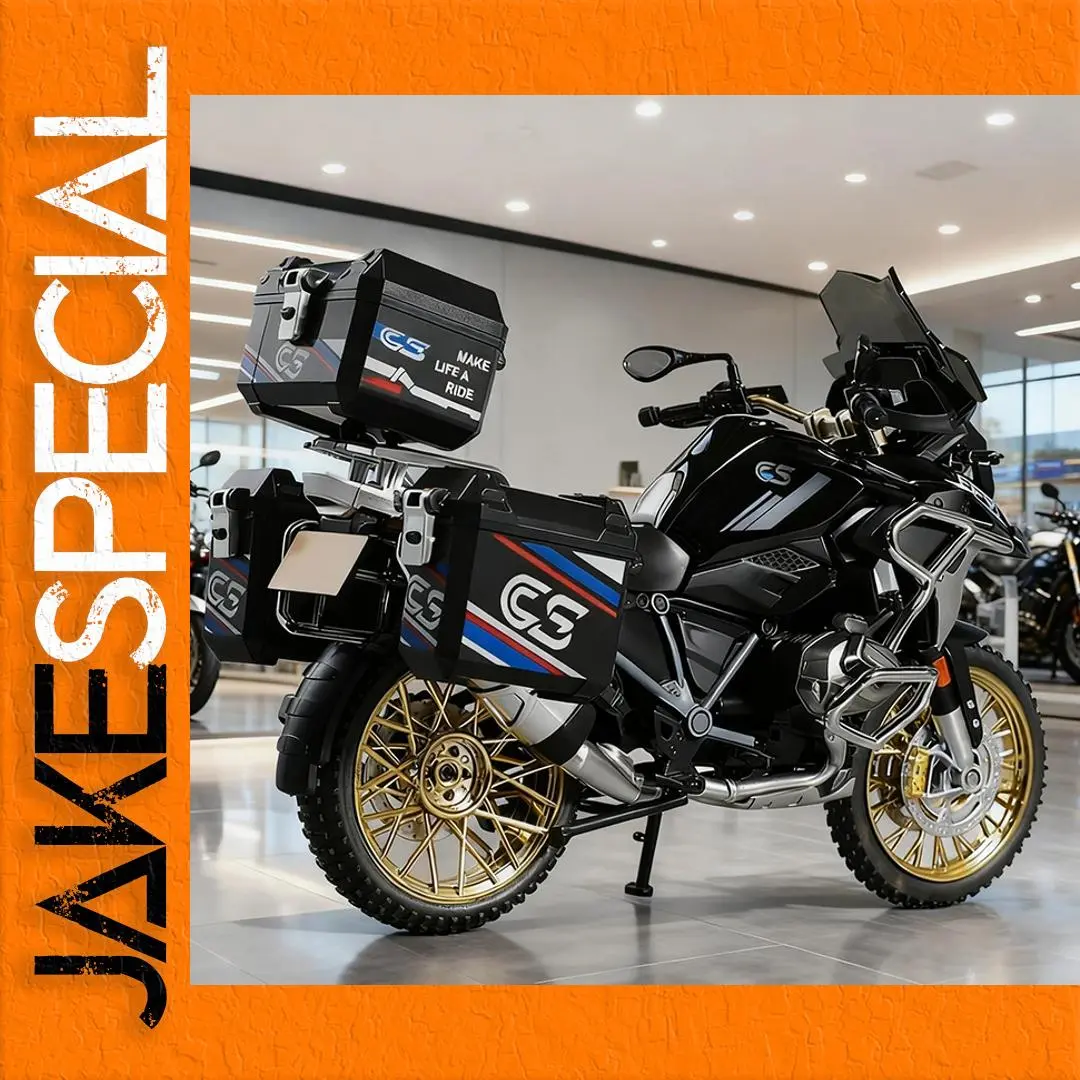Immerse yourself in the rugged world of motorcycle collectibles with this highly detailed 1:10 scale die-cast model of the BMW R1250GS Adventure. Crafted from durable alloy and plastic, this replica captures every intricate element of the original bike, from its angular, aerodynamic design to the bold off-road tires with deep treads. The model features a sleek black finish, accented by striking gold or yellow spoked wheels, and detailed rear luggage boxes decorated with decals and signature BMW stripes. With realistic front fairing details, a slightly tinted windshield, and textured seat, it exudes adventure and durability. Equipped with sound and light effects, it offers an immersive display for enthusiasts and collectors alike.