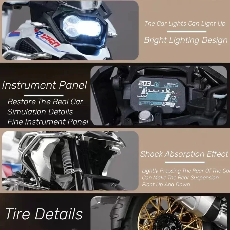 This diecast motorcycle model is perfect if you're looking to enrich your collection with a highly detailed and realistic replica of the BMW R1250GS. Its premium metal construction, authentic decals, and intricate details make it an impressive display piece. Whether you're a motorcycle enthusiast or collector, this model offers a lifelike representation that captures both the design and spirit of the popular off-road adventure motorcycle. Add this stunning model to your collection today and enjoy the craftsmanship and authenticity it brings to your display, creating a visual centerpiece that’s sure to impress.