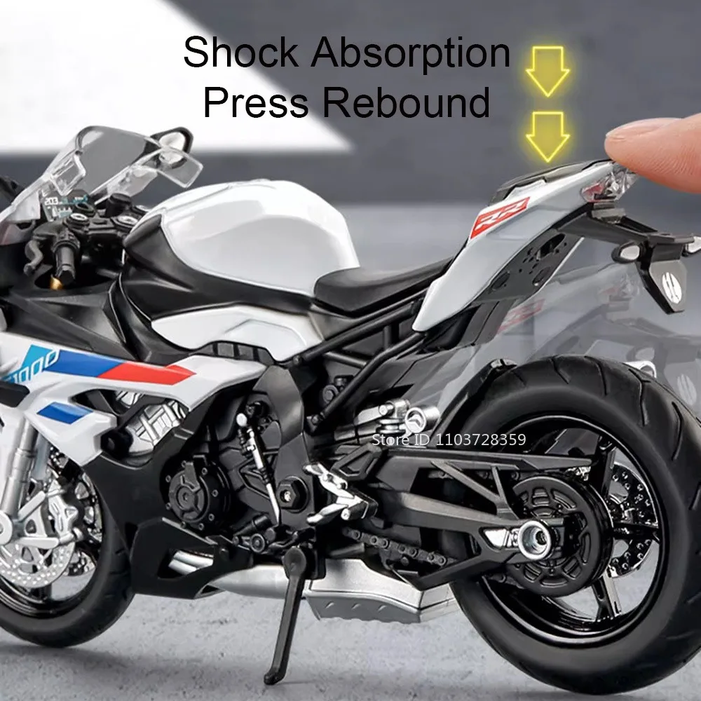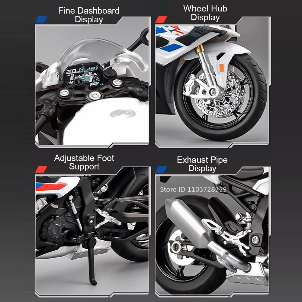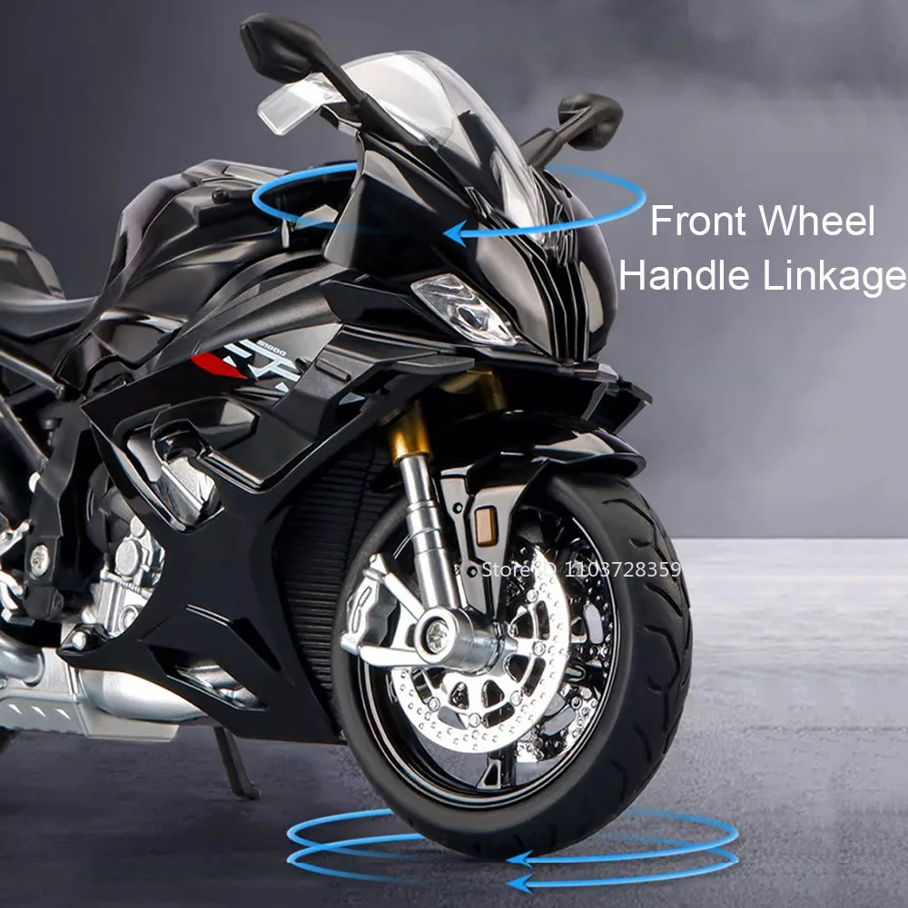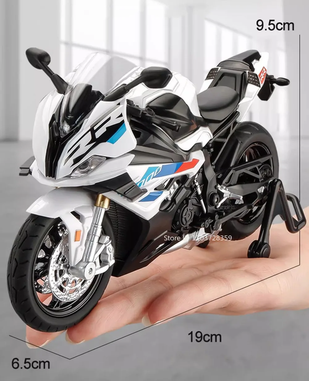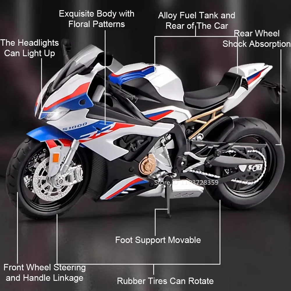 Experience the thrill of owning a highly detailed, 1:12 scale replica of the iconic BMW S1000RR motorcycle. Crafted with a durable zinc alloy body, plastic chassis, and rubber tires, this model blends realism with sturdy construction. Its sleek design features aerodynamic contours, vibrant color options—black, white, red, and blue—and intricate details such as a textured seat, exhaust system, and chain drive. The motorcycle boasts functional shock absorption in the wheels, front wheel steering for realistic turns, and a retractable support frame. Perfect for collectors or as a striking display piece, it provides a tactile, engaging experience that mimics real riding dynamics. Enhance your collection with this exceptional, high-quality model.