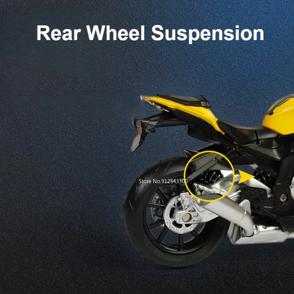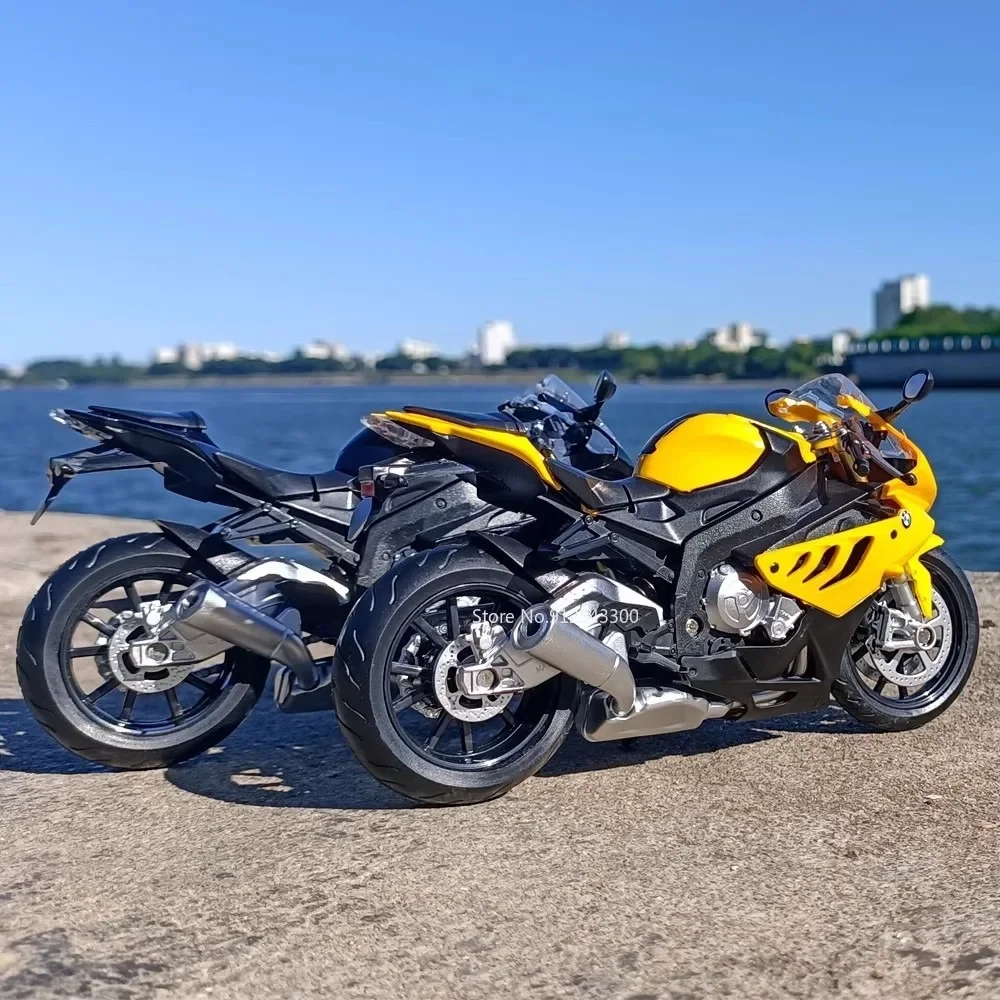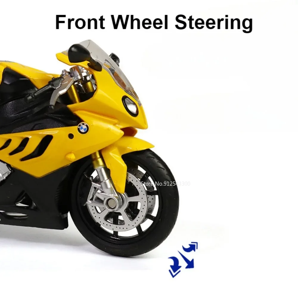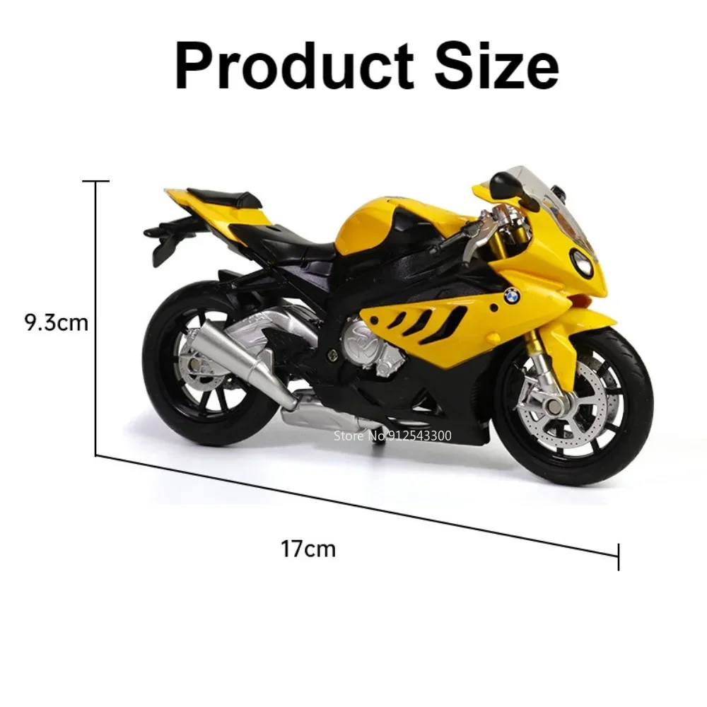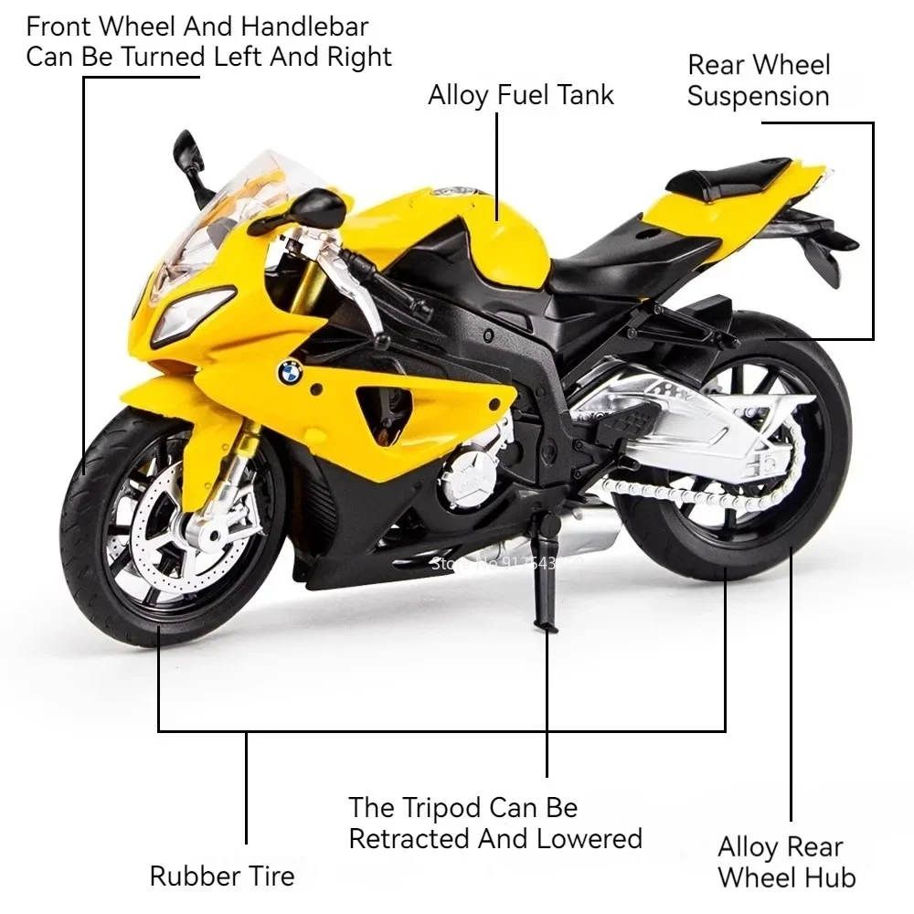 Experience the dynamic design of this 1:12 scale BMW S1000RR motorcycle model, featuring a durable alloy body in striking yellow and black with a plastic chassis and rubber tires. Measuring about 17 cm in length and 9.3 cm wide, it offers authentic details like front wheel steering, rear suspension, and a retractable tripod for added realism. Crafted from diecast metal for strength and durability, this high-simulation vehicle is perfect for collectors or display, providing a lifelike representation of the sporty S1000RR. Suitable for ages 14 and up, it combines precision engineering with striking aesthetics to bring your passion for motorcycles to life.