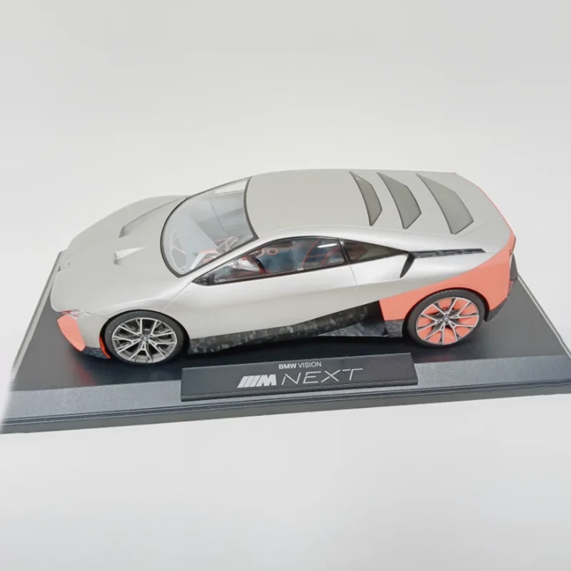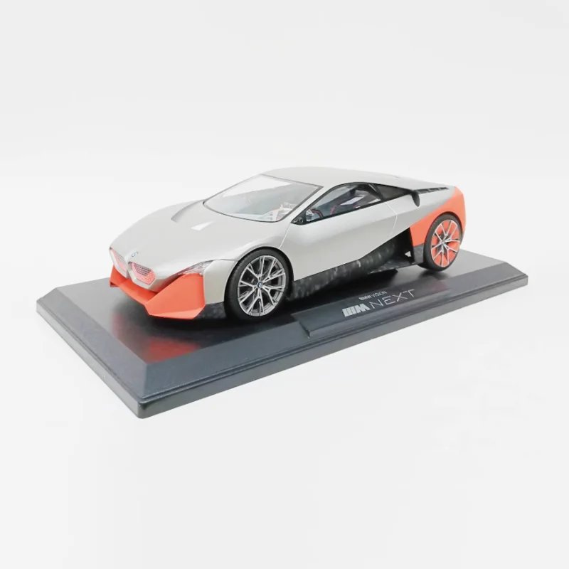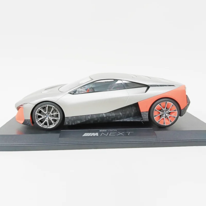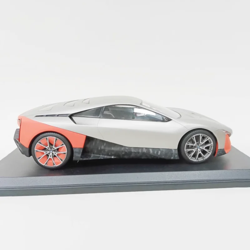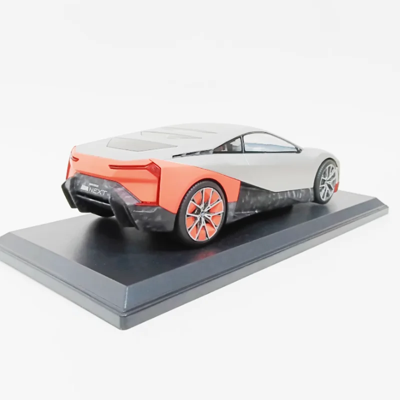 Bring home a meticulously crafted replica of BMW's futuristic vision with this 1:18 scale alloy diecast model. Perfect for car enthusiasts and collectors, it offers exceptional realism, highlighting sophisticated design elements. Its glossy finish showcases a striking two-tone color scheme with a sleek white base contrasted by vibrant orange accents on the rear quarter panels and bumper, adding a sporty touch. The aerodynamic shape includes smoothly flowing lines, a low-profile stance, and detailed features such as sharply contoured headlights, a streamlined hood, and transparent side windows revealing a minimalist interior. The model's multi-spoke alloy wheels with fine metallic detail further elevate its premium appeal. This static display piece is an ideal addition to your collection, capturing the essence of modern automotive innovation.