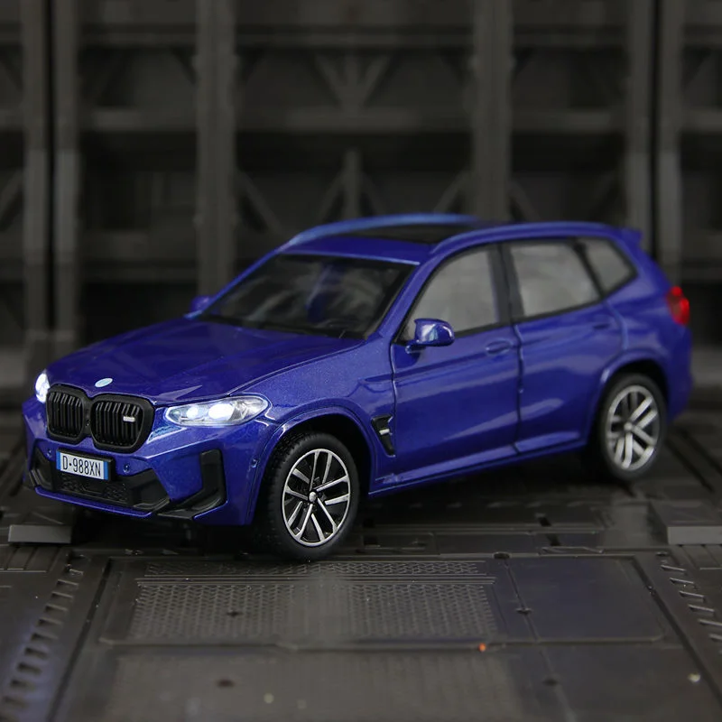Experience the thrill of owning a highly detailed, 1:32 scale diecast replica of the iconic BMW X3M SUV. Crafted from premium alloy and plastic, this model boasts a sleek, realistic design with a glossy finish. Its vibrant blue color highlights sculpted side lines, a well-defined front grille with chrome accents, and illuminated LED-style headlights that add authenticity. The intricate alloy rims with multi-spoke patterns enhance its premium look, while transparent windows reveal subtle interior details. The rear features realistically styled red tail lights, completing its upscale appearance. Perfect for display or collection, this model combines durability with stunning visual appeal, making it a must-have for enthusiasts who want a sophisticated piece that embodies style and precision.