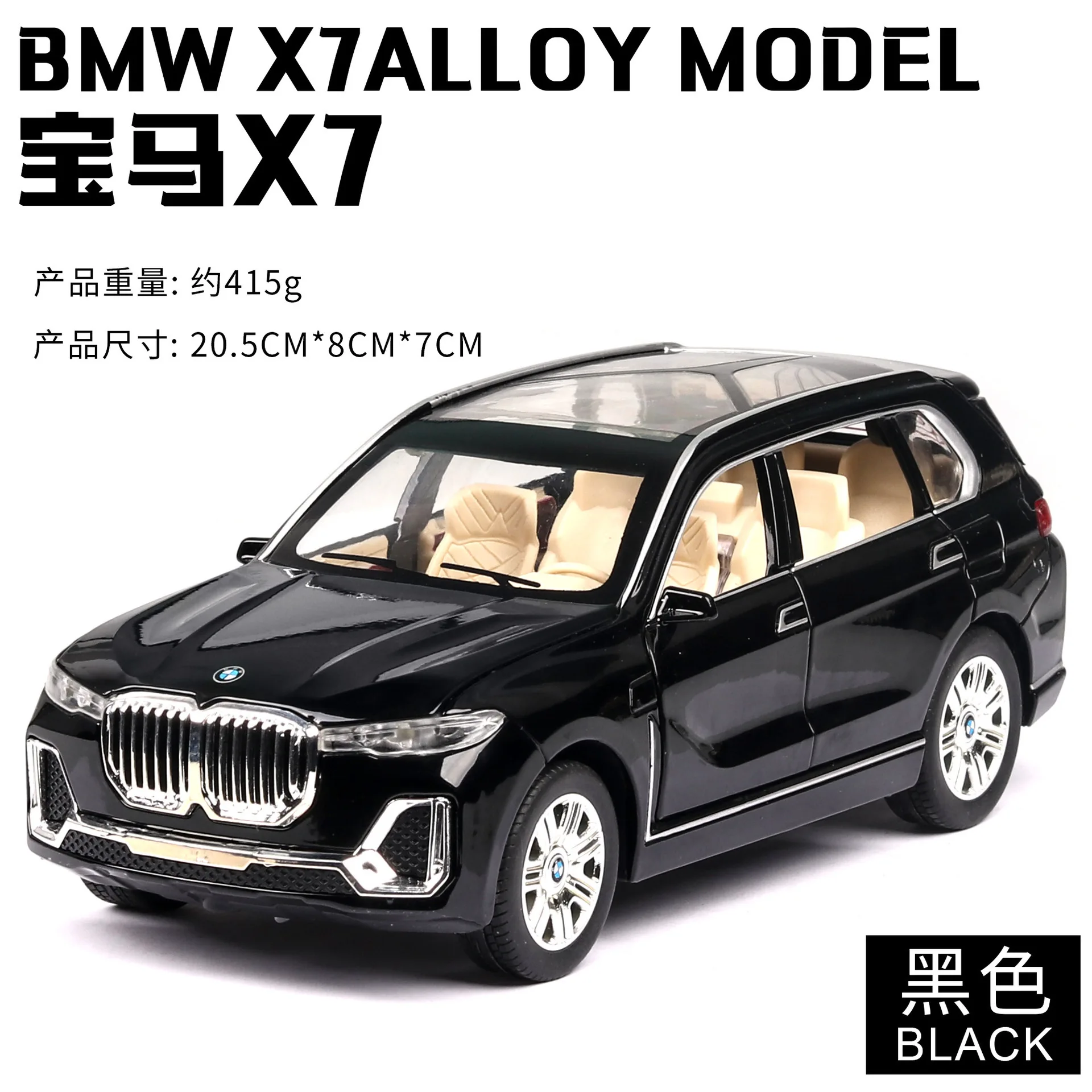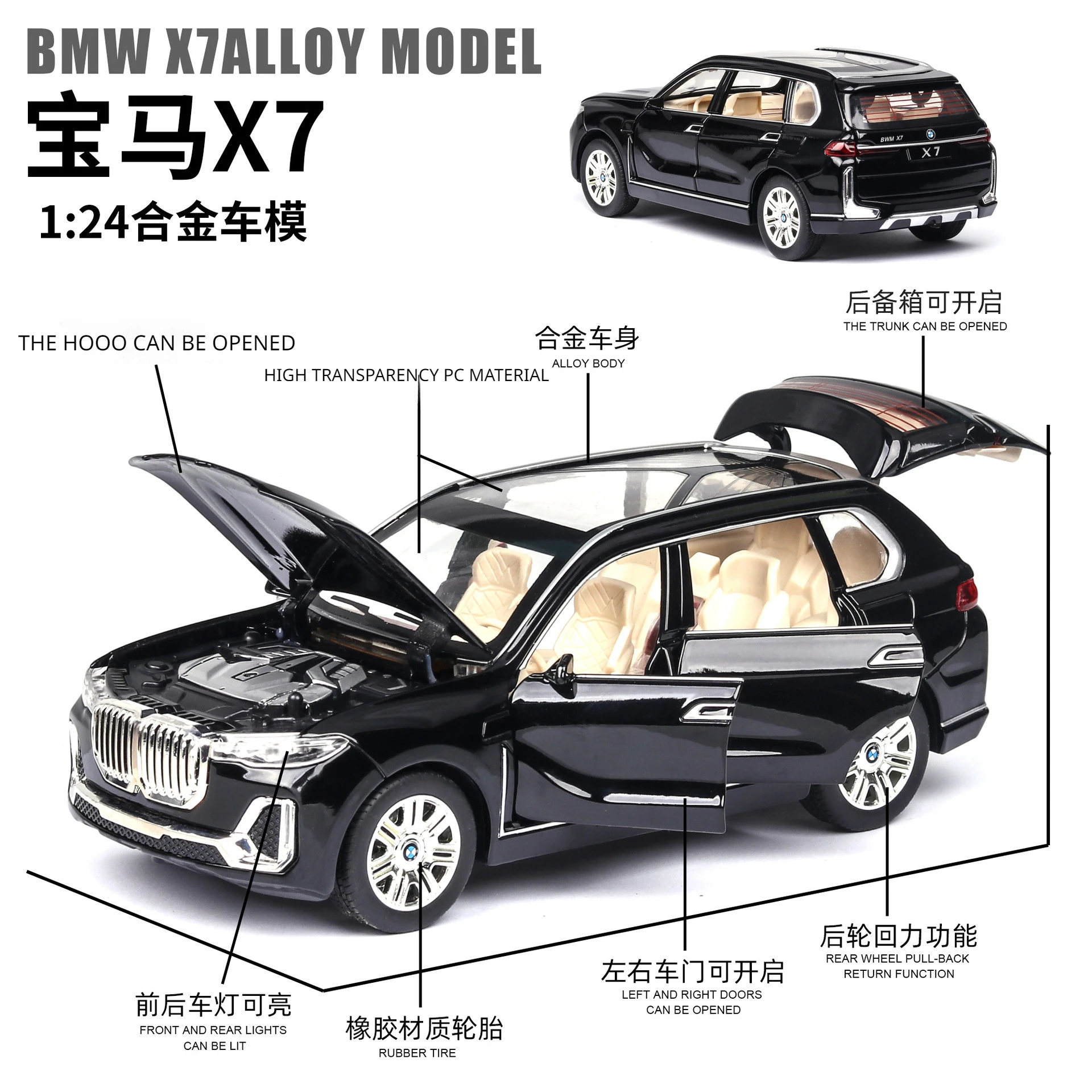 - Available in multiple colors including black, blue, gray, white, red, and green, representing popular BMW SUV models like X5, X7, and XM, with precise scale and detailed design.