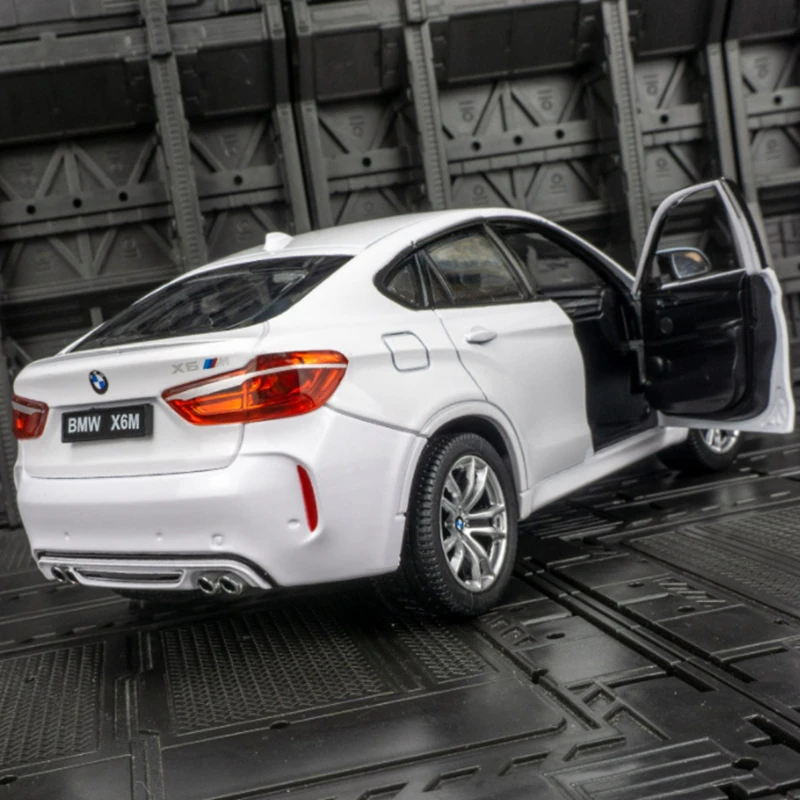Imagine adding a sleek, highly detailed replica of the BMW X6 M Coupe to your collection. Crafted with precision from alloy and plastic, this 1:24 scale model measures approximately 20.5 centimeters in length, 8.5 centimeters in width, and 7 centimeters in height. Its glossy white finish captures the vehicle's elegant design, complemented by realistic details like the black kidney grille, elongated headlamps, dark tinted windows, and accurately rendered alloy multi-spoke wheels. Every contour and body line reflects the original's sporty character, making it a perfect display piece for enthusiasts. Whether for display or gifting, this model brings the iconic BMW X6 M Coupe to life in your hands, combining craftsmanship with passion.