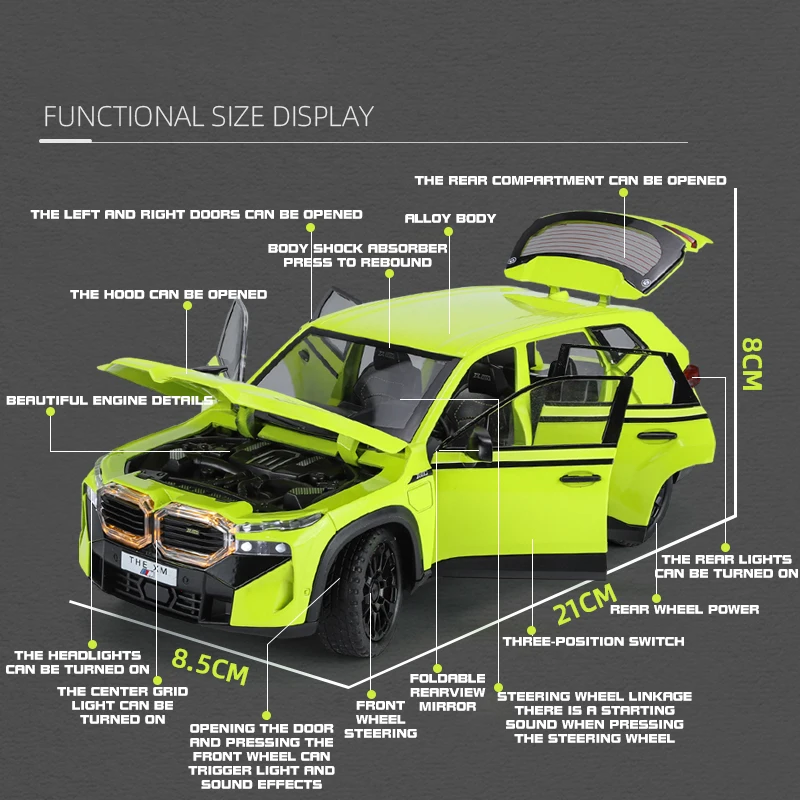 Don’t miss the chance to elevate your collection with this exceptional BMW XM diecast model. Imagine owning a piece that combines realistic detailing, striking aesthetics, and interactive lighting and sound features all in one. It’s an ideal gift for any car enthusiast or a stunning decorative piece for your space. With its impeccable craftsmanship and sophisticated design, this model captures the essence of luxury and sporty excellence. Purchase today and enjoy a piece of automotive artistry that will bring admiration and conversation to your collection. Take action now—your perfect display awaits!