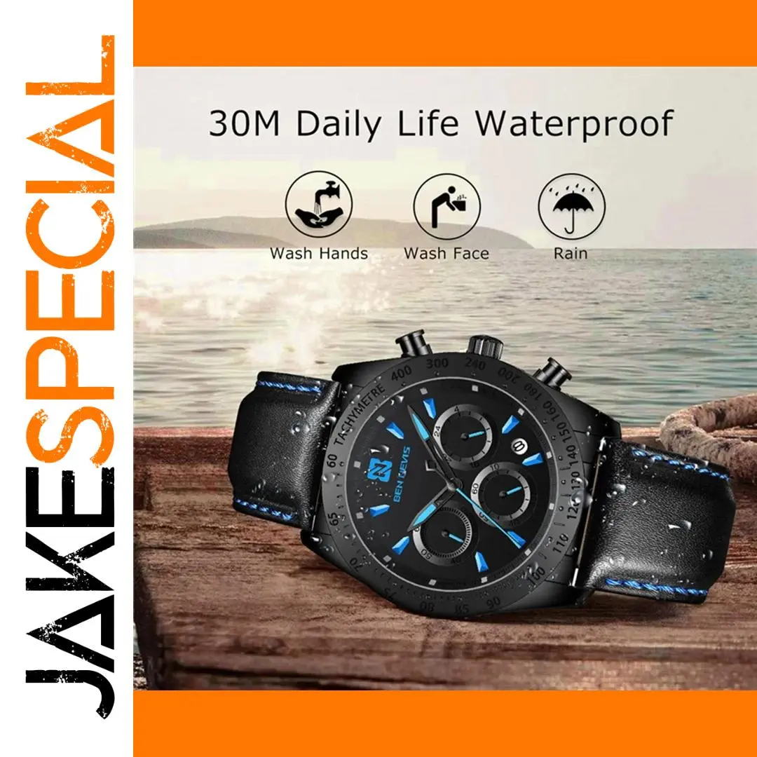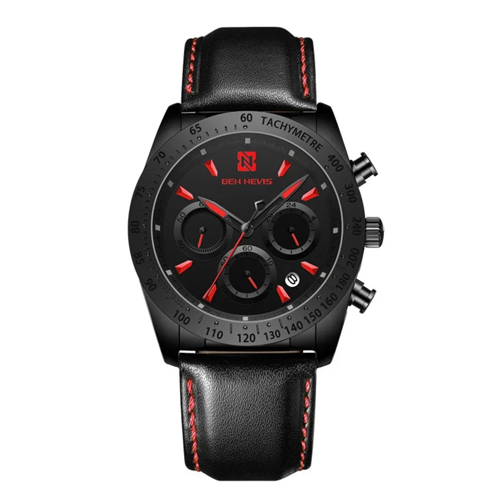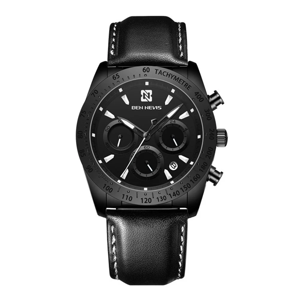 Experience the perfect blend of sporty elegance and daily practicality with this men's BN6011-1 quartz wristwatch. Its sleek black dial features a matte finish, subtly accented by luminous blue markers and hands that ensure excellent visibility even in low light. The 40mm aluminum alloy case and 9mm thickness provide a lightweight yet durable frame, complemented by a mineral tempered glass cover for scratch resistance. The screw-down crown guarantees waterproof integrity up to 30 meters, allowing you to wash your hands or swim confidently. The genuine leather strap, detailed with blue stitching, adds a stylish touch while ensuring comfort. This watch embodies versatility, suitable for casual, sporty, or semi-formal settings, making it a reliable companion for your everyday adventures.