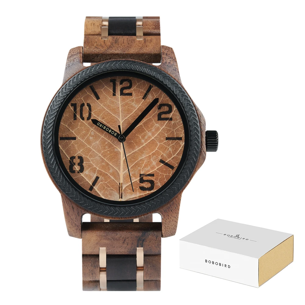 The BOBO BIRD GT155 Men’s Wooden Wristwatch showcases a stunning blend of craftsmanship and natural beauty with its 45 mm wooden case, crafted from rich walnut and ebony, and a thickness of 12 mm. Featuring a vibrant green leaf dial adorned with intricate vein patterns, this timepiece is protected by durable Hardlex crystal for longevity. It’s powered by precise quartz movement and has an adjustable wooden wristband measuring 20 to 24 mm in width, complete with a hidden clasp for comfort. Custom engraving options allow for personalization, making this watch a unique addition to your collection.