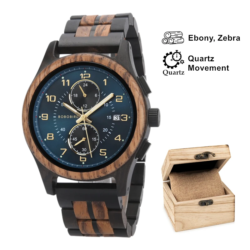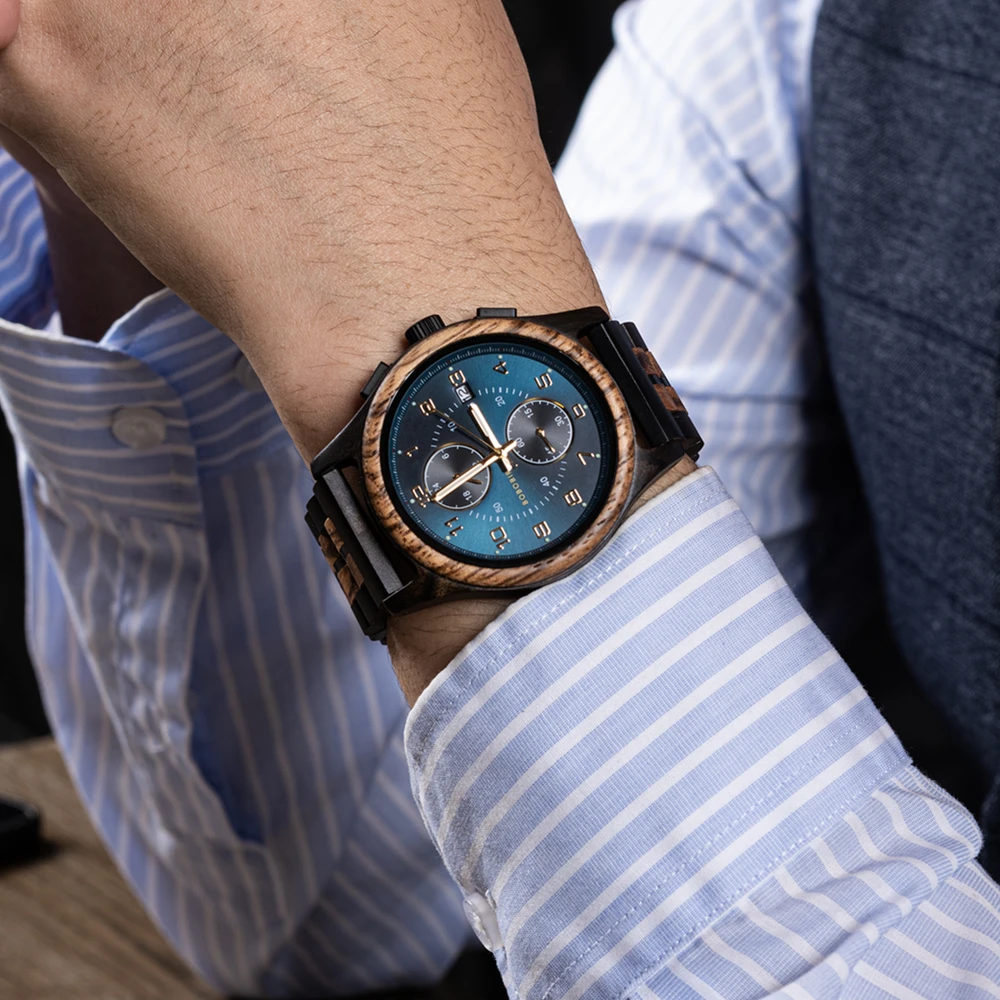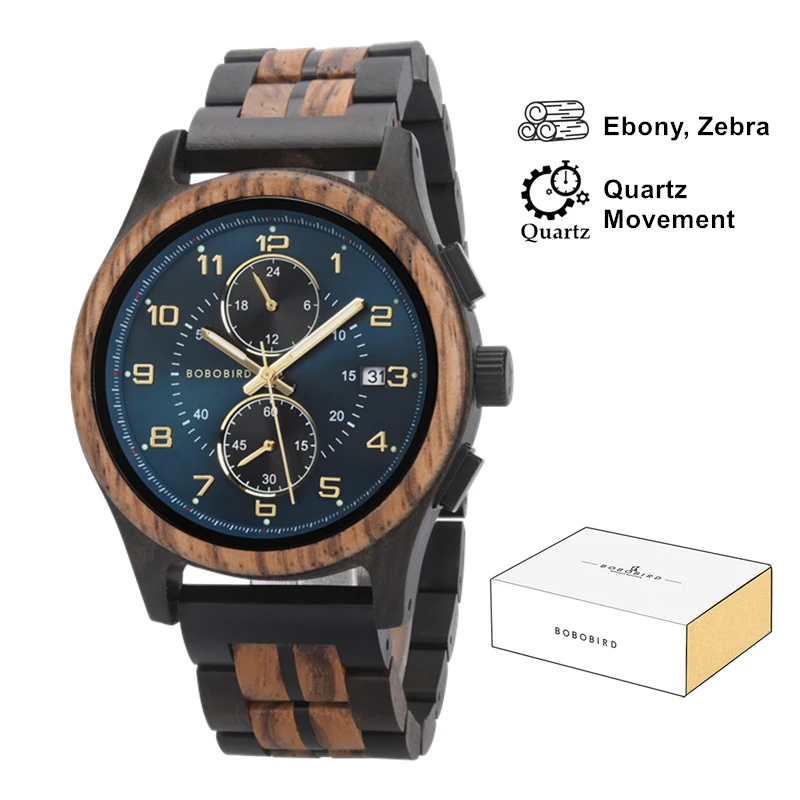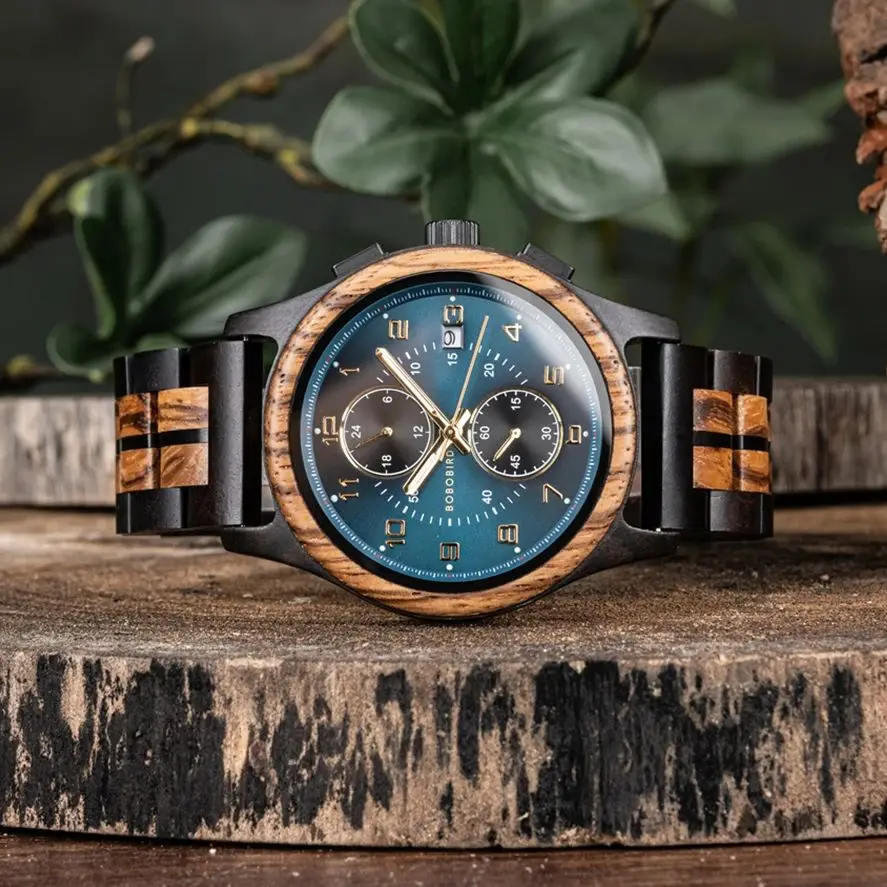 This men’s wooden watch by BOBO BIRD is a perfect blend of natural aesthetics and modern functionality. The round wooden case, crafted from rich dark wood, measures 12.8mm thick, ensuring a slim profile on your wrist. Weighing just 55 grams, this watch is incredibly lightweight and comfortable for all-day wear. The striking deep blue dial features a numberless display with bold white markings for the hours and minutes, accompanied by sub-dials for chronograph functions and a calendar. The watch strap, made of alternating dark and light wooden segments, adds a unique charm, and features a hidden clasp for a sleek look. Ideal for any occasion, this watch is a statement piece.