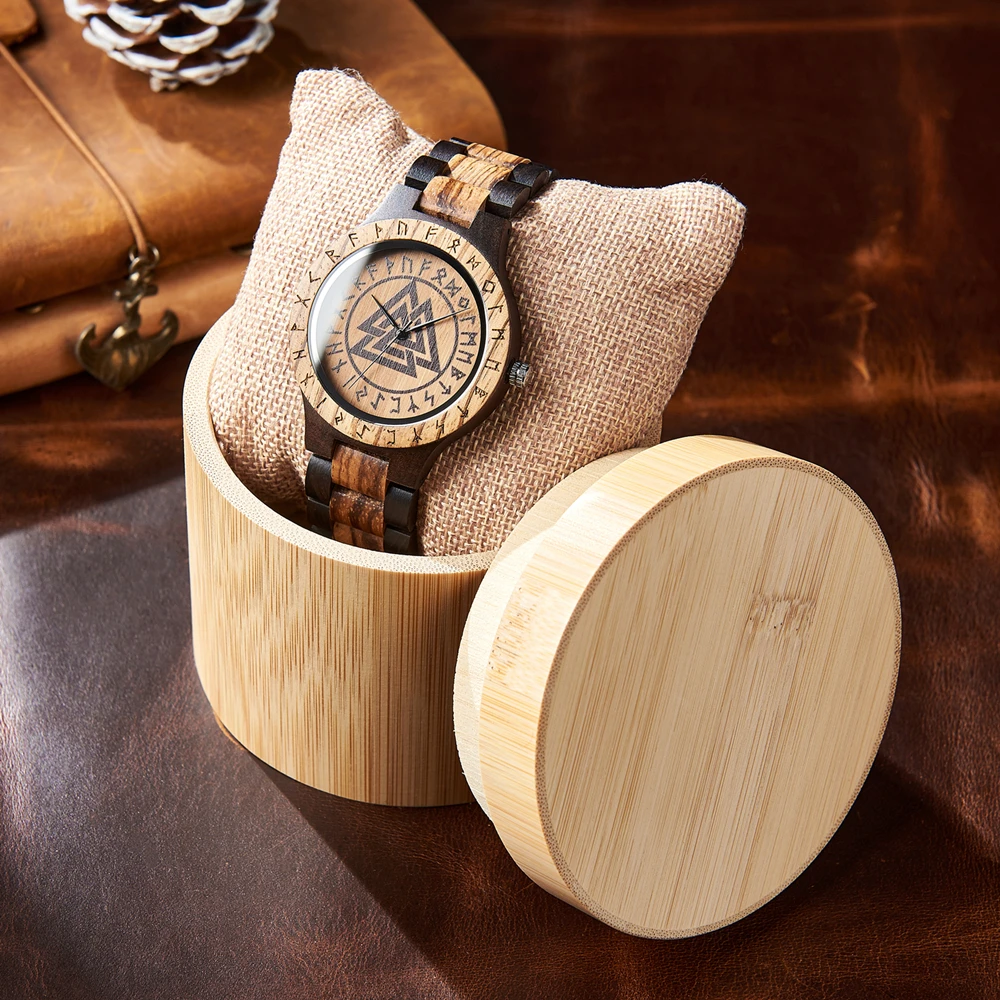 The BOBO BIRD Men's Viking Wooden Wristwatch combines antique-inspired design with modern craftsmanship. Its round wooden case showcases natural wood grain variations, while the lighter wood dial boasts a captivating Viking symbol encircled by runic characters. The clear Hardlex window protects the exquisite analog display, featuring two sleek pointed hands. The sporty band, crafted from alternating sections of dark and light wood, offers a comfortable fit, adapting to your wrist effortlessly. Perfect for any occasion, this timepiece balances vintage charm with contemporary appeal, making it an ideal addition to your collection.