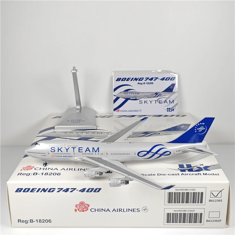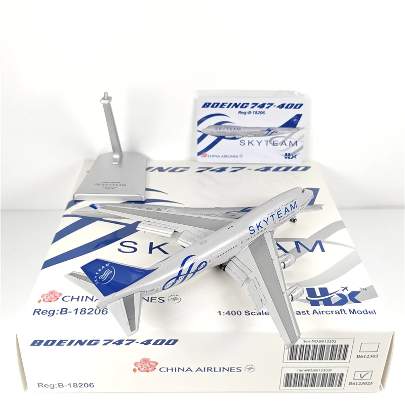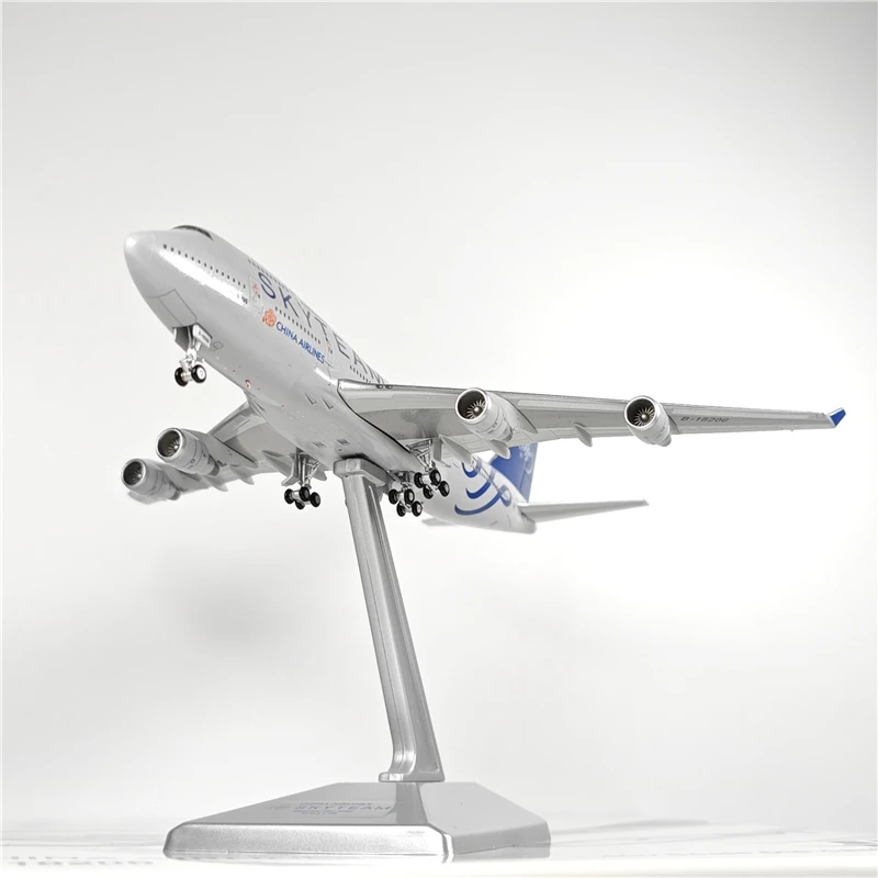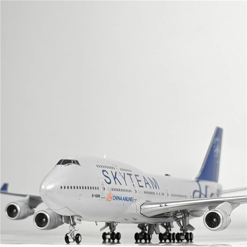 This 1:400 scale diecast model of a Boeing B747-400 measures approximately 17 cm in length, 15 cm in width, and 5 cm in height. Crafted from metal, plastic, and rubber, it features detailed wing flap components in “Wing Flap Ver.” color, with a sleek white finish and glossy surface that mimics the metallic sheen of the real aircraft. The model showcases authentic branding such as “SKYTEAM” and “AIRLINES” along the fuselage, complemented by a vibrant blue tail fin with markings. Designed for collectors aged 14 and above, it offers a realistic and visually striking display piece, complete with an original color box for presentation.