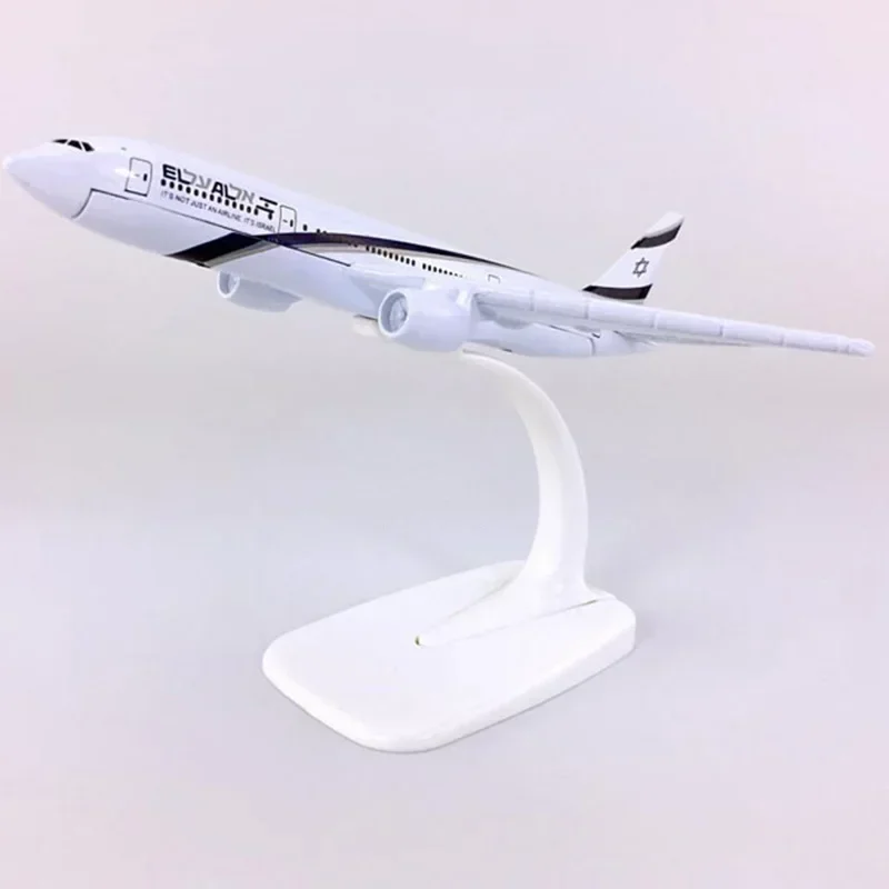 - The model features authentic El Al branding, including a blue Star of David logo on the tail and blue highlights along the fuselage, created with fine attention to detail.