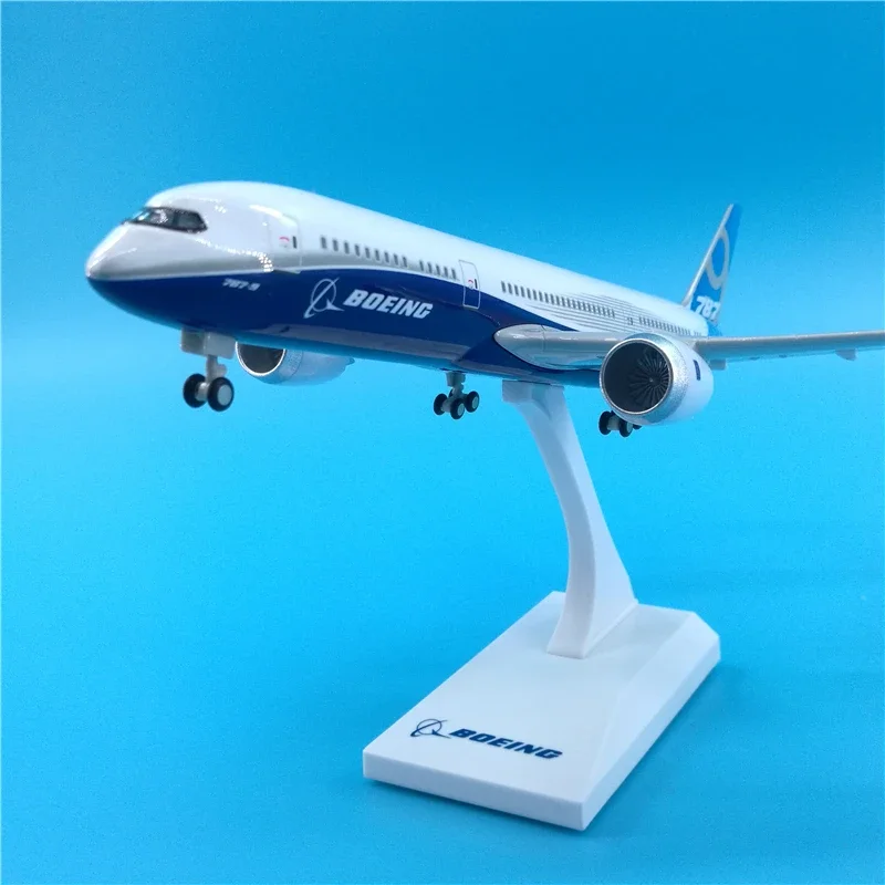 - Constructed from resin and plastic, it features a smooth, glossy surface that mimics the polished exterior of an authentic aircraft, with precise markings such as the Boeing logo and stylized “787” on the tail fin.