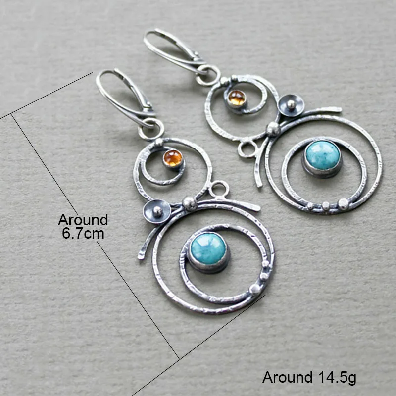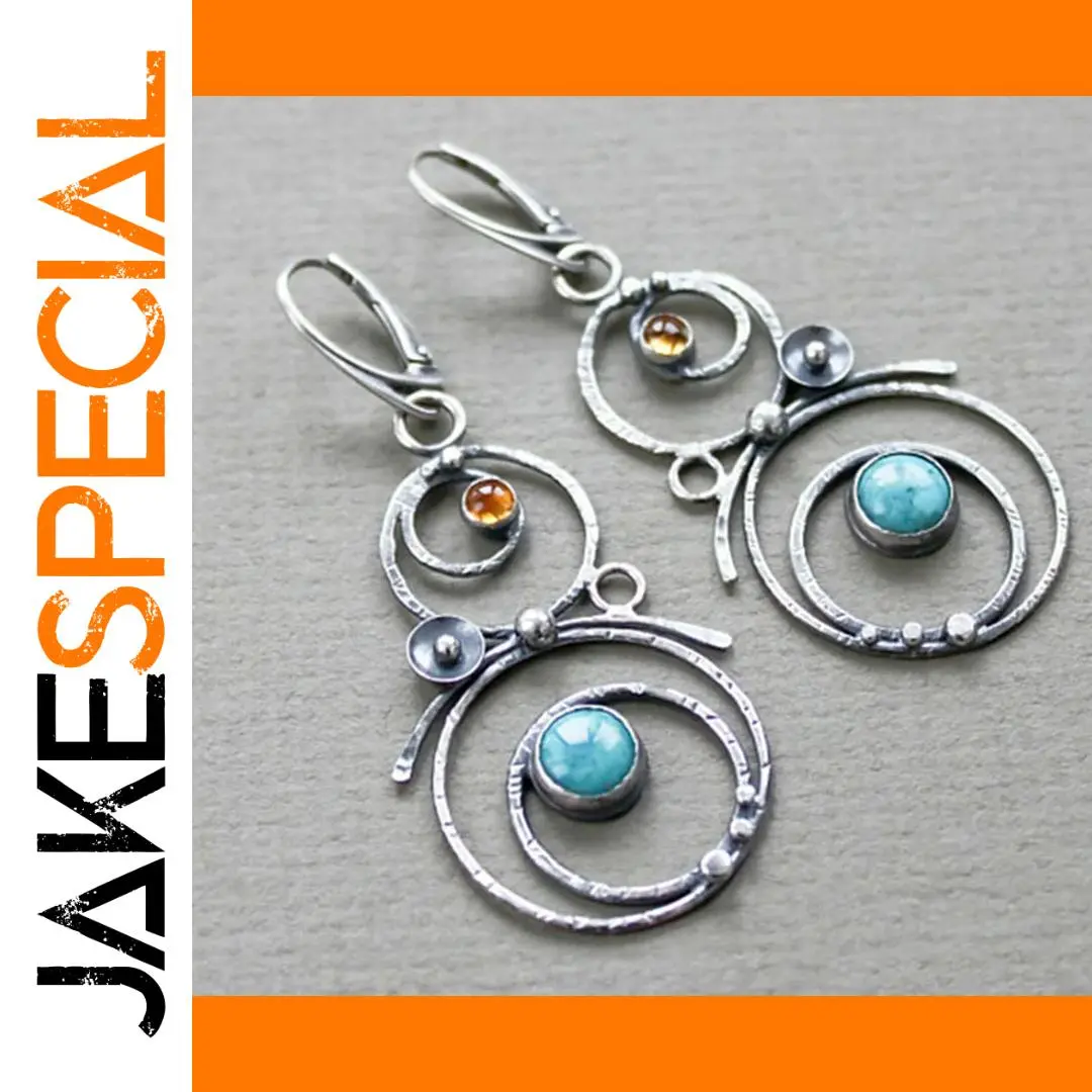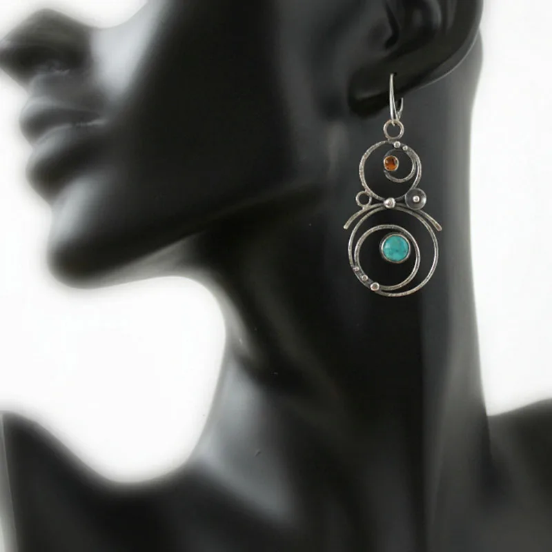 Transform your jewelry collection with these uniquely handcrafted bohemian-style earrings. Made from durable silver-colored zinc alloy, each pair features a striking round shape measuring approximately 1 to 2 centimeters, with slight manual size variations. The intricate design showcases layered concentric circles with a textured, hammered finish, evoking an artisanal, handcrafted appeal. At the center, a smooth, polished turquoise-colored bead adds a vibrant splash of blue, accented by small orange beads and metallic silver details, creating a lively contrast. Perfect for enhancing your style at parties, weddings, engagements, or daily outings, these earrings blend artistic craftsmanship with versatile fashion. Elevate your look effortlessly and embrace a bohemian-inspired aesthetic with every wear.