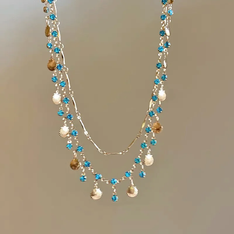 - Multi-layered design featuring a short, close-fitting choker with textured layers. The outer layer boasts seashell-shaped pendants and blue gemstones, perfect for a beachy, boho-chic aesthetic.