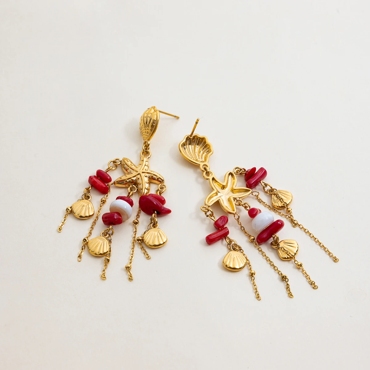 Experience the allure of seaside charm with this pair of stunning bohemian vacation style earrings. Crafted from durable stainless steel and plated with a luxurious 18K PVD gold finish, these earrings combine playful ocean-inspired motifs with trendy irregular shapes. The upper part features intricate, textured designs reminiscent of tribal or stylized artistry, while the large, dangling section showcases a layered cascade of gold seashells, starfish charms, and vibrant red and white beads. Perfect for adding a whimsical, beachy vibe to any outfit, these earrings are both stylish and versatile. Their lightweight design ensures comfort, making them ideal for daily wear or special occasions where you want to stand out with a unique, playful look. Elevate your jewelry collection with these eye-catching earrings and embrace the free-spirited vacation style.
