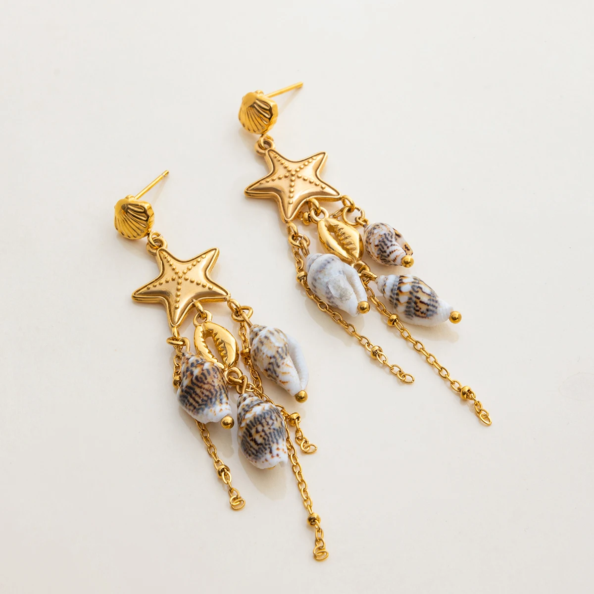 - Drop earrings designed for women, with a layered, dangling style that combines intricate textured motifs with vibrant ocean-inspired charms like seashells, starfish, and beads—ideal for a beach vibe.