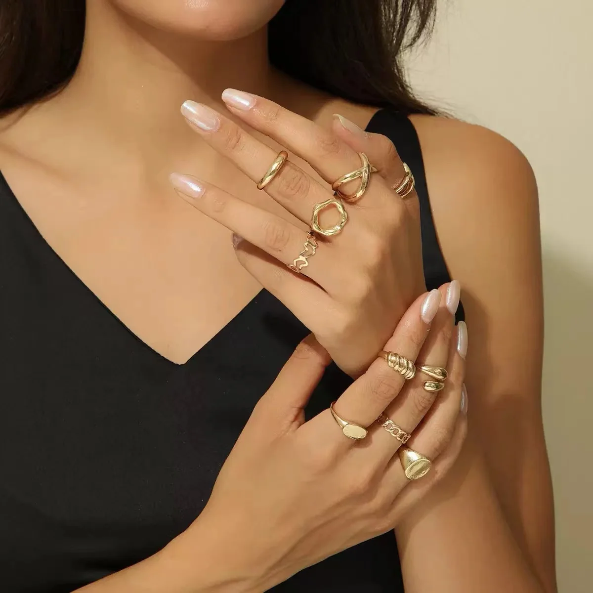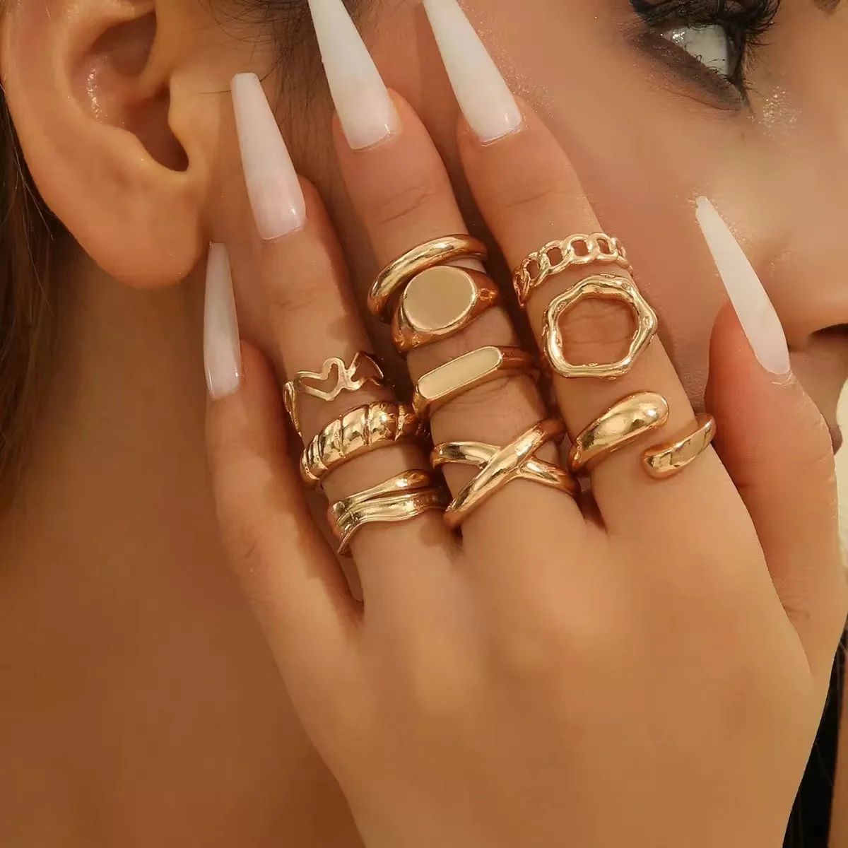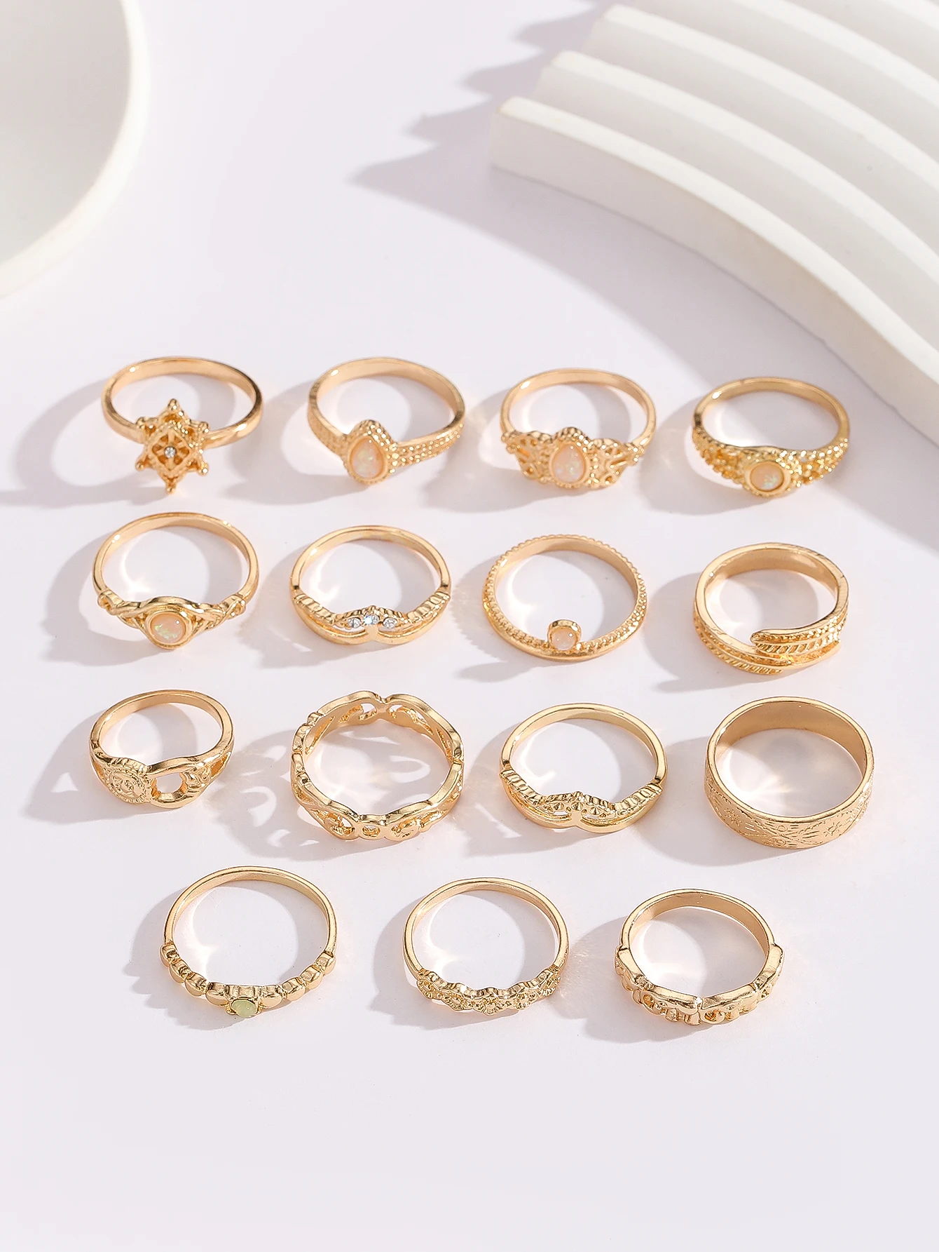 - Set of 15 layered rings made from durable zinc alloy with a shiny 14k gold plating for a luxurious appearance. Designed to suit various fashion styles and occasions, highlighting your unique taste.