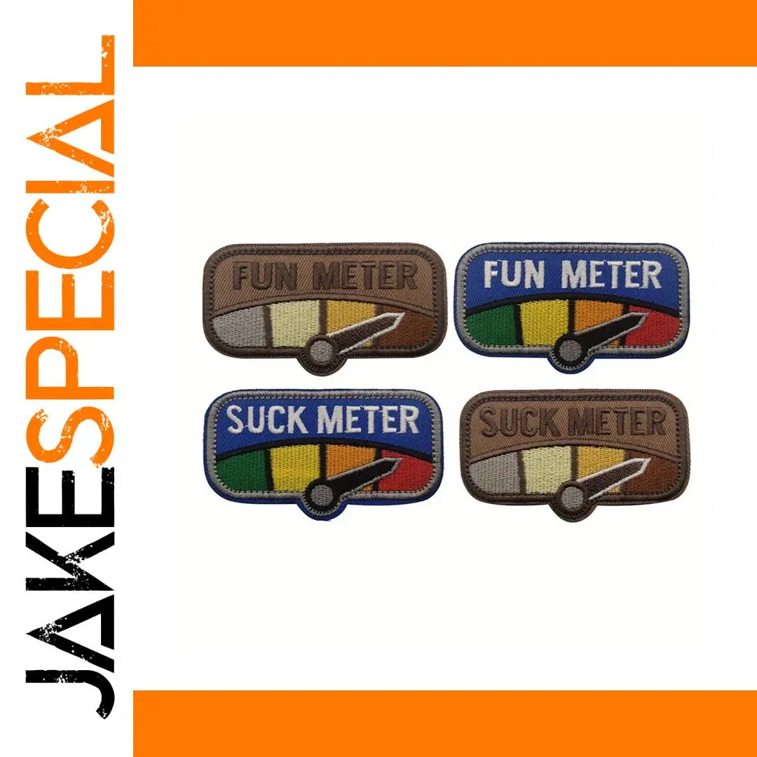 Enhance your gear with this set of four durable, vividly embroidered patches designed for versatile use. Crafted from high-quality nylon and polyester, each patch features a striking rectangular design with rounded edges. Two patches display the “FUN METER” and two show the “SUCK METER,” each in contrasting color schemes: rich brown and bright blue backgrounds, stitched with matching threads for clarity and style. The gauge graphics on each patch are highly detailed, with a needle pointing toward the right, situated over a segmented background of yellow, green, orange, and red—representing levels from low to high. Perfect for attaching to jackets, backpacks, hats, helmets, or military vests, these patches combine aesthetic appeal with durability for both casual and tactical environments.